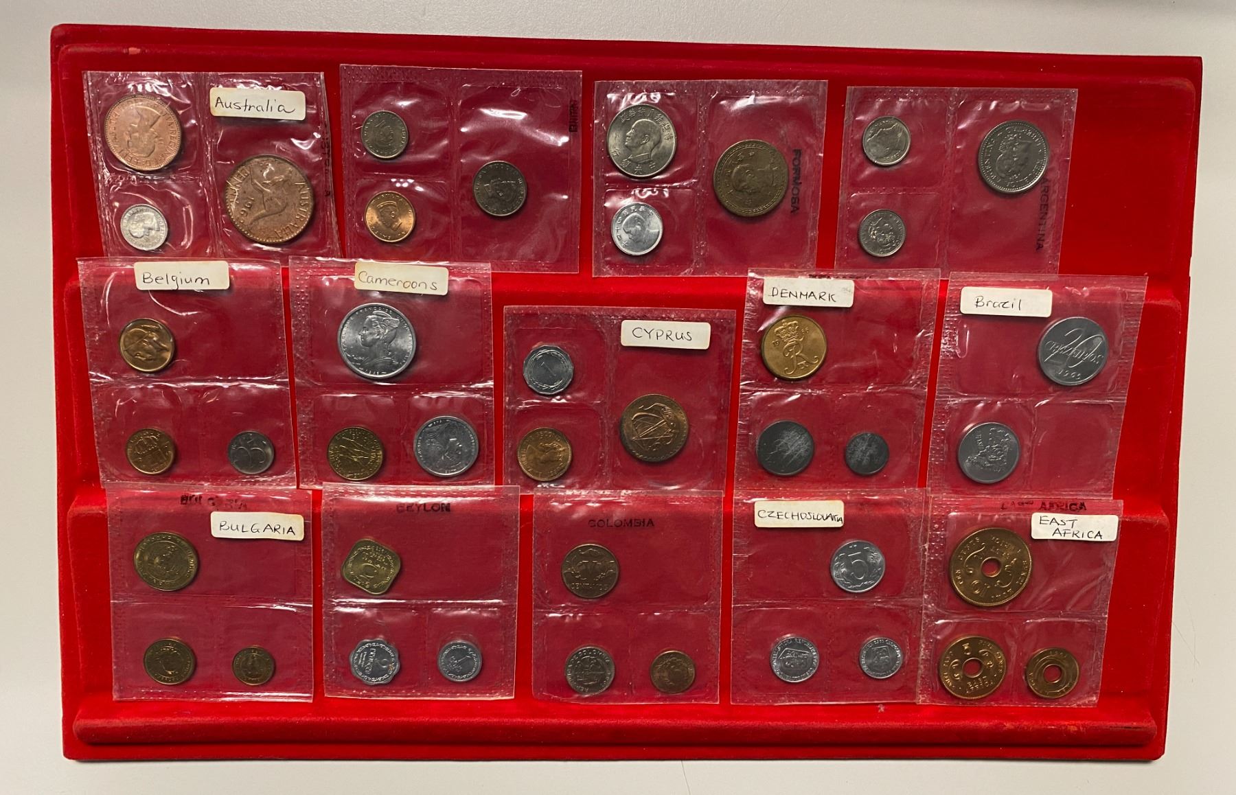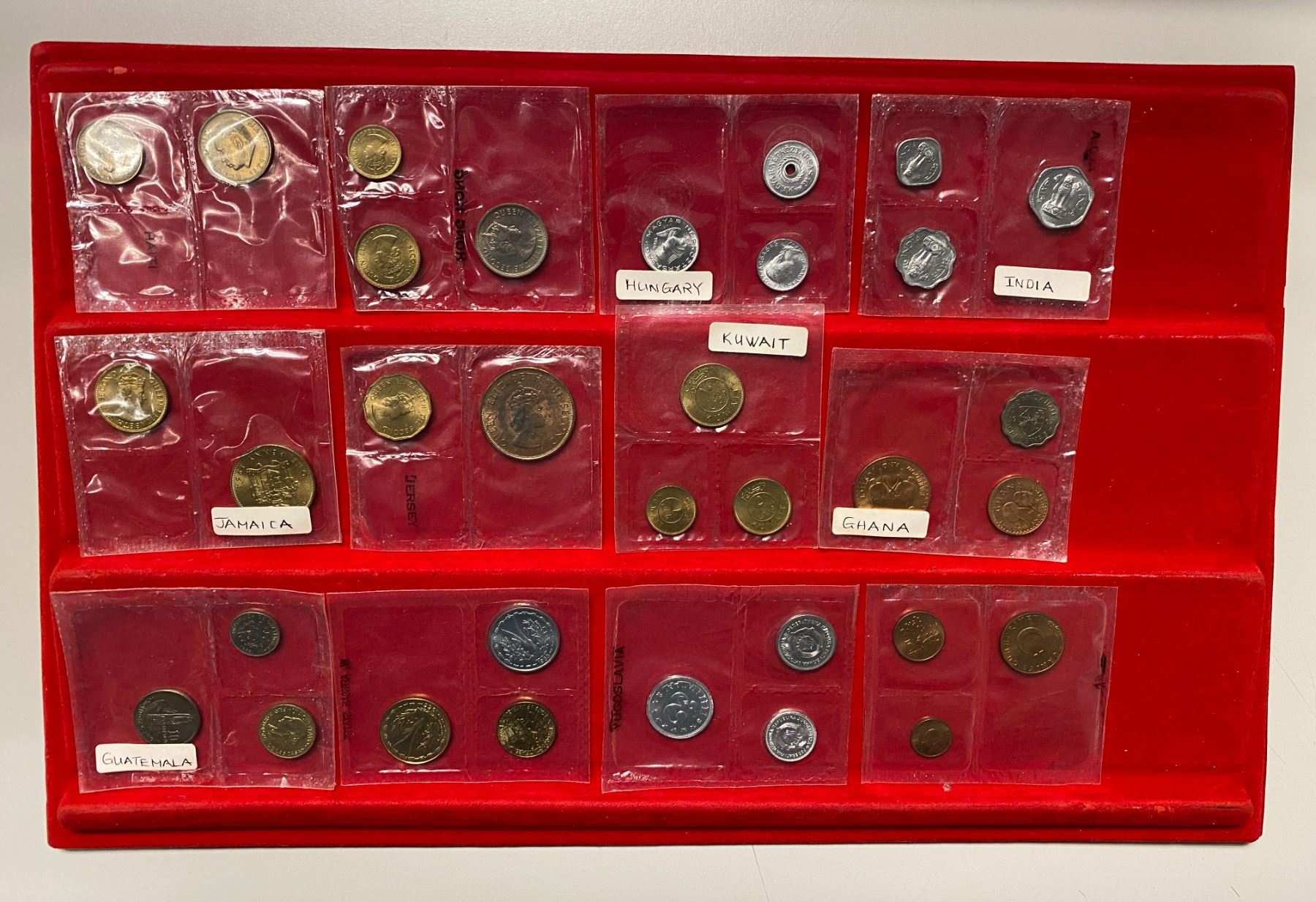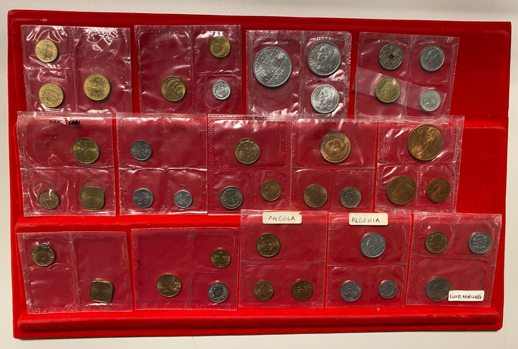 WORLDWIDE: LOT of 86 sets, sets of circulation coinage by country, in pliofilm, including Algeria, Angola, Argentina, Bulgaria, Cameroon, China (Taiwan), East Africa, French Oceania, Ghana, Greece, Guatamala, Honduras, Hungary, Korea/South, Kuwait, Lebanon, Macao, Malaya and British Borneo, Monaco, Myanmar, New Caledonia, Nigeria, Pakistan, Philippines, St. Pierre and Miquelon, Somalia, South Arabia, Sudan, Syria, Tanzania, Turkey, West African States, etc., etc.; almost all are unc, from the 1950s and 60s, mostly 3- and 4-coin sets, in wooden box, viewing recommended; retail value $500, lot of 86 sets.