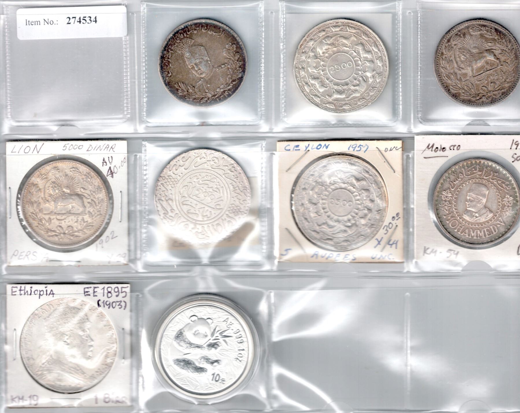 WORLDWIDE:LOT of 9 silver crown sized coins including coins from China, Morocco, Ceylon, Iran, Ethiopia, average circulated including some UNC coins, retail value $475, lot of 9 coins.