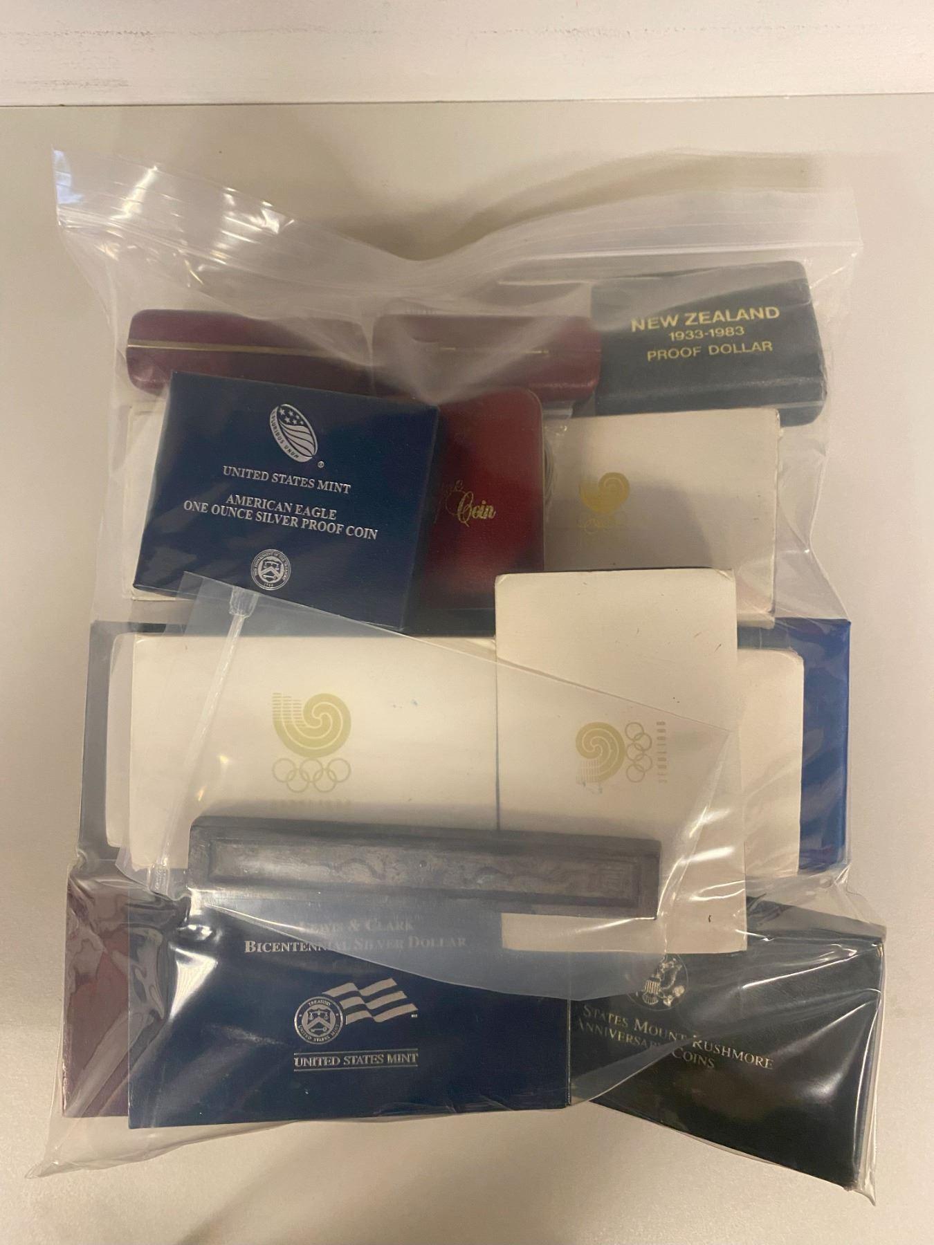 WORLDWIDE: lot of 23 singles and sets, including Australia (1, 1971 proof set), China (1, modern non-silver bar), Korea/South (8, all 2-piece AR sets for the 1988 Olympics), New Zealand (5, including 3 proof silver dollars and 2 proof sets), Russia/Federation (1, 1993 unc Ballerina), Singapore (2, both AR Zodiac proof 10 dollars), and United States (5, 4 AR proof commemorative dollars and one proof 2-coin set of the 1992 Olympics); all uncirculated and proof, in original cases except 1982 Singapore 10 dollars, some packaging shows wear; retail value $1000, lot of 23 items.