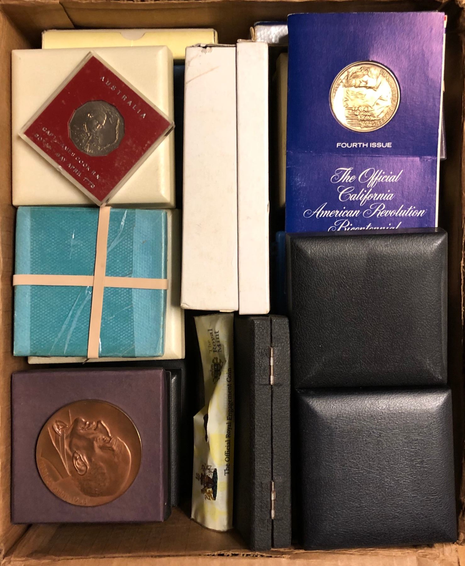WORLDWIDE:large LOT of 34 cased coins and medals: Scandinavian Nordisk Kunstmedalje Series large medals (70mm, about 275g each): Denmark: 1975 H.C. Andersen, 1979 Jens Rosing-Bird; Faero Islands: 1975 Longboat/Vesturkirkjan Church, 1979 Jens Rosing-Bird; Greenland: 1975 Polar Bears; Iceland: 1973 Puffin-Heimaey, 1974 Salmon, 1977 Fish, 1980 Hobgoblin; Norway: 1975 Oil Platforms/Mother and Child, 1976 Fish-Folke Truedsson, 1977 Fish and Man; Sweden: 1978 Carl von Linne', and 1979 Shorebird; 1958 Max Planck Institute medal, ND Romania Membru de Onoare medal, 2005 City of Whitefish Montana Centennial large medal, ND Portugal Protecção á Natureza large medal, ND (Portugal?) Darwin Evolution large medal by Agmos and Amaral, Humboldt University-Berlin porcelain medal, 1975 WM Florida Calendar medal, 1978 Leipzig Zoo Centennial medal, 1975 Denmark Animal Protection medal, ND Warsaw Numismatic Cabinet medal, 1982 Portugal Darwin/Skulls Evolution medal, 1974 Iceland Reykjavik 1100 Years medal, 1964 Israel Festival medal, 2011 Great Britain 5 pounds William & Catherine Engagement, 1976 California American Bicentennial medal-John Muir, ND John Roberts Restore Nature's Balances medal, 1972 Iceland Fishing Limits medal, 2014 Austria 25 euro Evolution with Niobium core, 1970 Australia 50 cents Cook, and 1962 Dachau Memorial medal; all pieces in original boxes/cases, all Uncirculated, retail value $700, lot of 34 pieces, ex Jim Farr Collection.