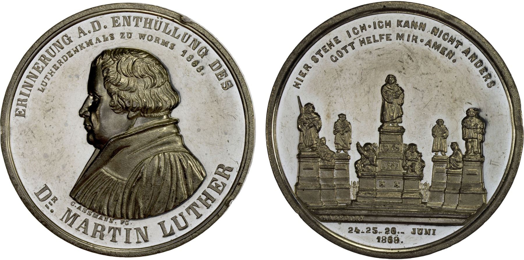 WORMS: medal (42.89g), 1868, Whiting-742, Zak-282, Goppel-593, Joseph-440, Belli Coll.-2230, 47mm white metal medal for the Erection of the Luther Memorial in Worms by Assmann and Hagedorn, bust left with ERINNERUNG A.D. ENTHÜLLUNG DES / LUTHERDENKMALS ZU WORMS 1868. above and Dr. MARTIN LUTHER below // facing view of the Memorial with HIER STEHE ICH.ICH KANN NICHT ANDERS / GOTT HELFE MIR AMEN. above and "24-25-26- JUNI / 1868." in exergue, hairlined, a couple rim tool marks, prooflike, plain edge, Unc.