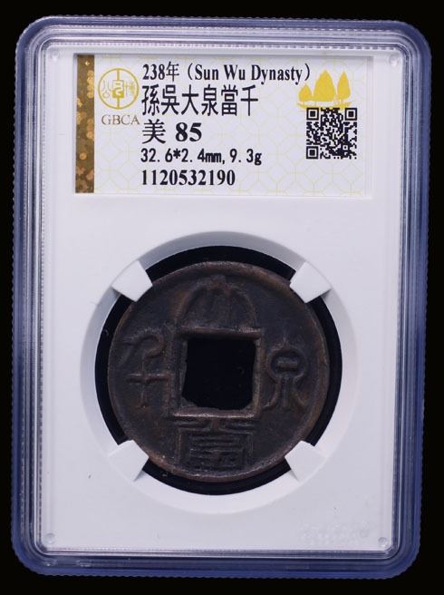 WU: Anonymous, 222-280, AE cash (9.3g), H-11.33, da quan dang qian (large coin value one thousand), medium-sized planchet, graded 85 by GBCA Grading Company, VF. In 238 AD, Sun Quan, King of Wu, coined the "value 1000" coins. Copper held in private hands was confiscated and exchanged for these coins in order to prevent illicit coining. All these coins are thought to have been cast in Nanjing or in Hubei. Eastern Wu (Sun Wu) was one of the Three Kingdoms competing for control of China after the fall of the Han Dynasty in the Jiangnan (Yangtze Delta) region of China. During its existence, its capital was largely at Jianye, modern Nanjing, but at times was at Wuchang. During the decline of the Han dynasty, the region of Wu - a region in the south of the Yangtze River surrounding Nanjing - was under the control of the warlord Sun Quan. Unlike his competitors, he did not really have the ambition to be Emperor of China. However, after Cao Pi of Cao Wei and Liu Bei of the Shu Han each declared themselves to be the Emperor, Sun Quan decided to follow suit in 229, claiming to have founded the Wu Dynasty. Sun Quan's long reign resulted in the stabilizing of the south. Wu and Shu had a military alliance, to defeat Wei in the north. Wu never managed to gain territory north of the Yangtze river, but Wei never managed to take territory south of the river. Eastern Wu was finally conquered by the first Jin emperor, Sima Yan, in 280. Wu was the longest-lived of the three kingdoms.