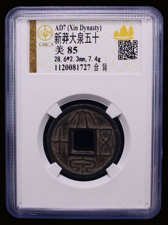 XIN: Wang Mang, 7-23 AD, AE cash (7.4g), H-9.8, da quan wu shi, double-sided inscriptions, graded 85 by GBCA Grading Company, XF, ex Dr. Dirk Löer Collection.