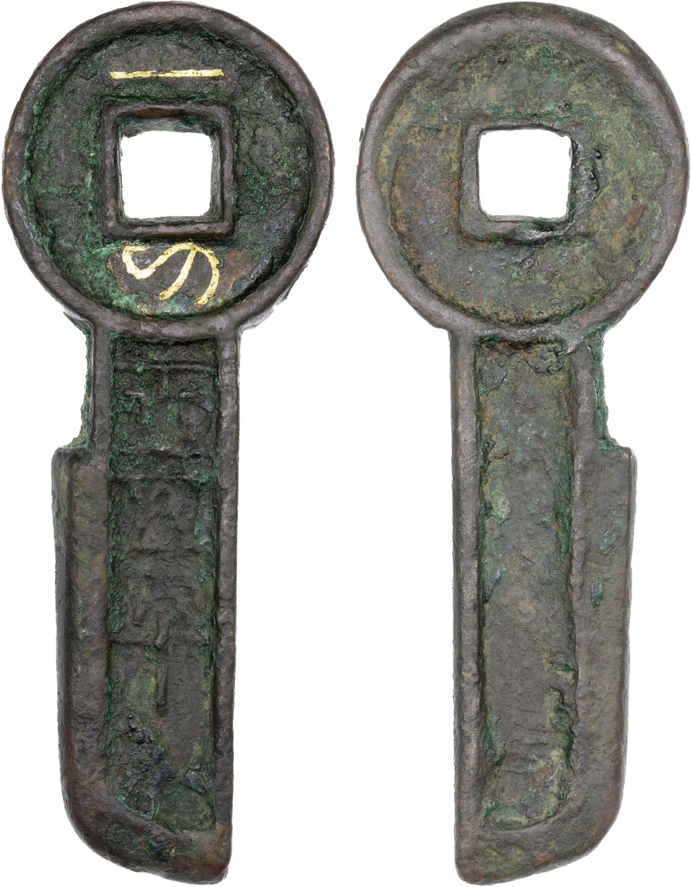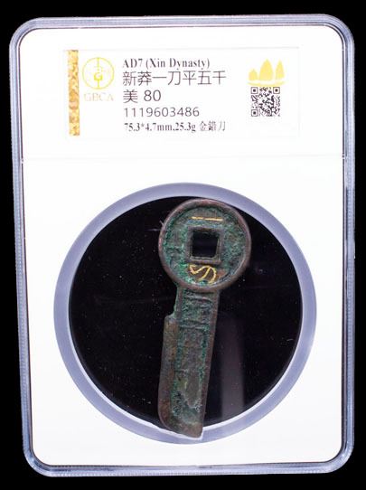 XIN: Wang Mang, 7-23 AD, AE gold key money (33.4g), H-9.12, yi dao ping wu qian (one knife worth five thousand) with the words yi dao written in gold inlay, graded 80 by GBCA Grading Company, VF, ex Dr. Dirk Löer Collection. At that time 5000 Wu Zhu was equal to 1/2 cattie of gold. A cattie weighed about 120 grams, so these knives were valued at about 60 grams (2 ounces) of pure gold. We have not been able to find a relative value for gold in ancient China, but in the same time frame in the Roman Empire, two ounces of gold would have been at least a year's wages to an average citizen, thus the problem with this issue. It was fiat currency with a named value very high, but with little intrinsic value.