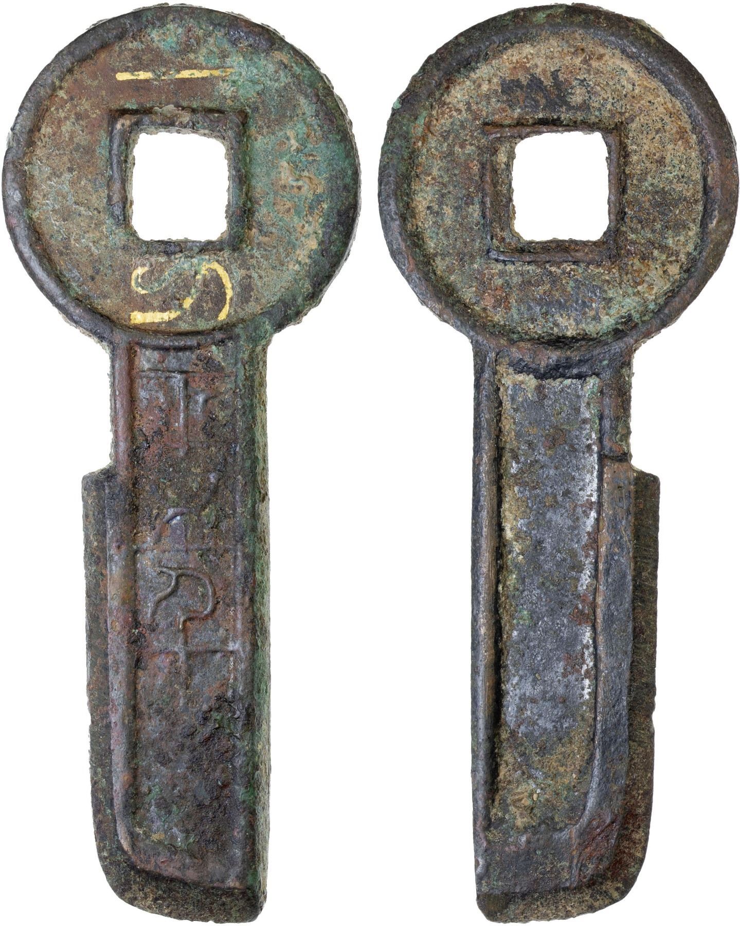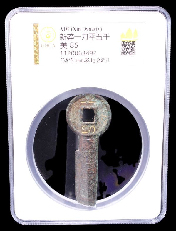 XIN: Wang Mang, 7-23 AD, AE gold key money (35.12g), H-9.12, yi dao ping wu qian (one knife worth five thousand) with the words yi dao written in gold inlay, minor encrustation, graded 85 by GBCA Grading Company, a lovely example of this rare and popular type! XF, ex Zhao Quanzhi Collection. At that time 5000 Wu Shu was equal to 1/2 cattie of gold. A cattie weighed about 120 grams, so these knives were valued at about 60 grams (2 ounces) of pure gold. We have not been able to find a relative value for gold in ancient China, but in the same time frame in the Roman Empire, two ounces of gold would have been at least a year's wages to an average citizen, thus the problem with this issue. It was fiat currency with a named value very high, but with little intrinsic value.