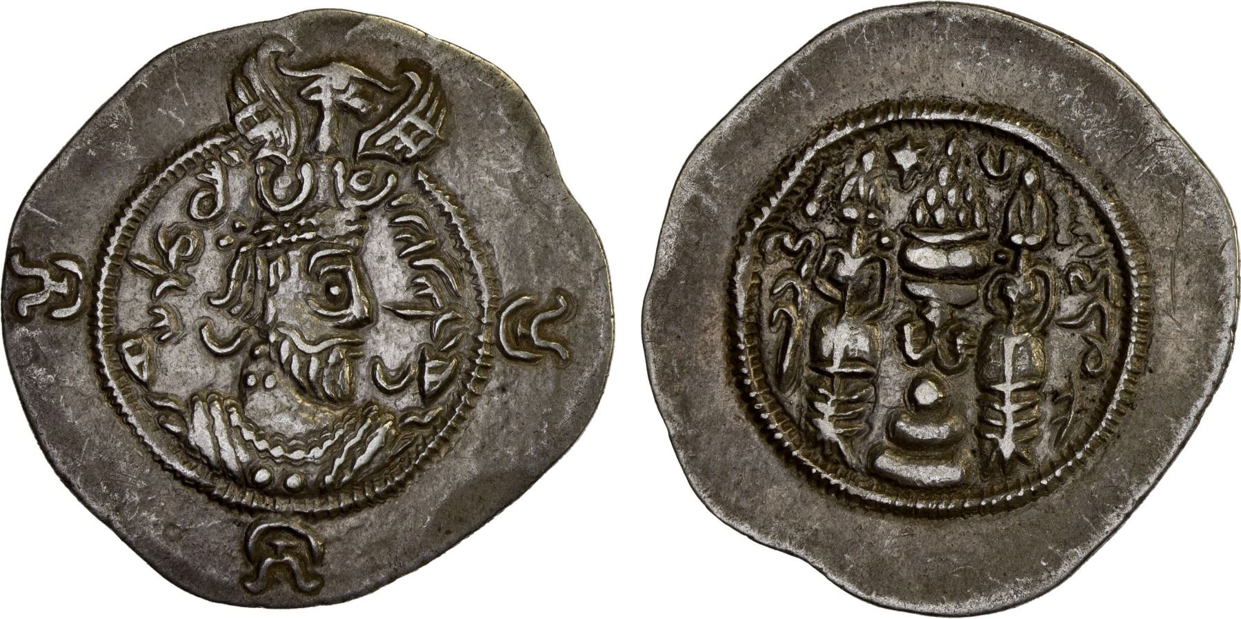YABGHUS OF TOKHARISTAN: Anonymous, 7th century, AR drachm (4.03g), ND, Vondrovec-265A, winged bust right derived from the Sasanian Vistahm (591-596), with bull's head added atop the crown // standard fire altar & two attendants, Pahlavi KS at left, blundered legend right; unusual variant we have not seen before, XF, RR.
