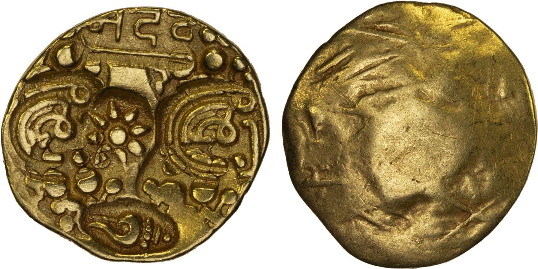 YADAVAS OF DEVAGIRI: Bhillama V, ca. 1185-1193, AV pagoda (3.31g), Mitch- (page 139), Zeno-48562, lotus, sri x2, uncertain symbol x4, and the name of the ruler, VF-XF, RR.