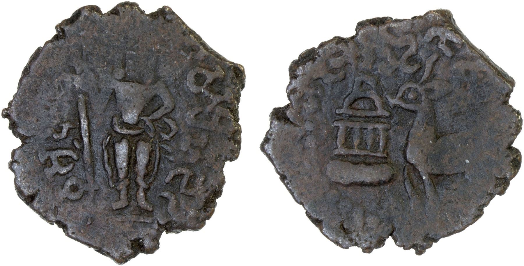 YAUDHEYA: Anonymous, 1st/2nd century AD, AE round unit (5.26g), Pieper-1631, single-headed Karttikeya, legend // deer facing temple, temple symbol to left, strong VF, R.