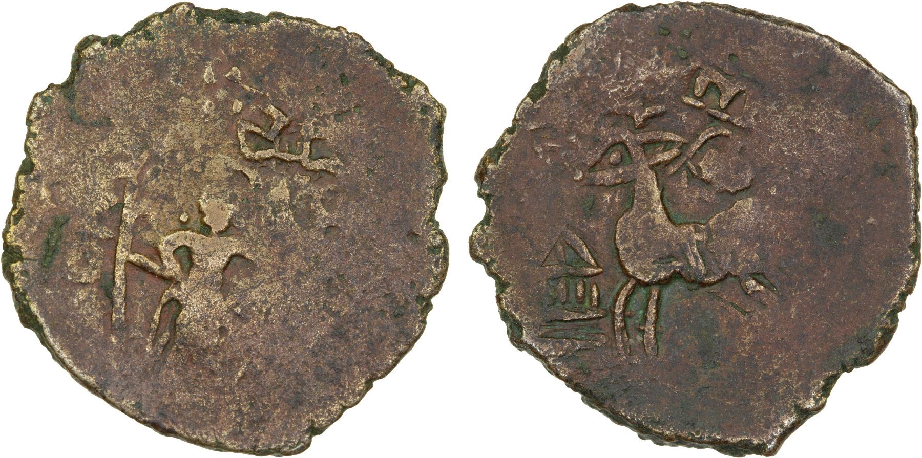 YAUDHEYA: Anonymous, 2nd century AD, AE unit (3.72g), Pieper-1630 (this piece), single-headed Karttikeya holding spear, legend around // deer to left with nandipada and vase above, temple building to left, VF-XF, R, ex Wilfried Pieper Collection.