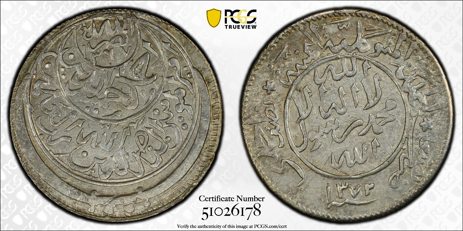 YEMEN: Ahmad bin Yahya, 1948-1962, AR 1/2 ahmadi riyal, San'a, AH1372/68, Y-16.1, an attractive example, PCGS graded MS62, ex Almer H. Orr III Collection.