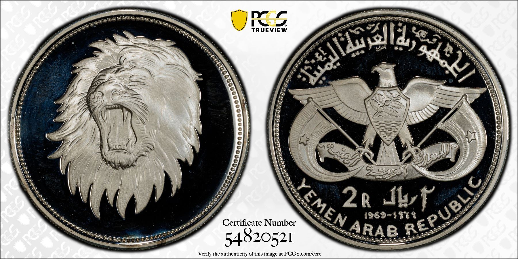 YEMEN: Arab Republic, AR 2 riyals, 1969, KM-4, Qadhi Mohammed Mahmud Azzubairi Memorial-Lion, PCGS graded PF68 Deep Cameo.