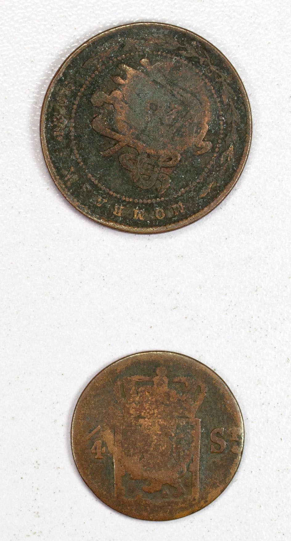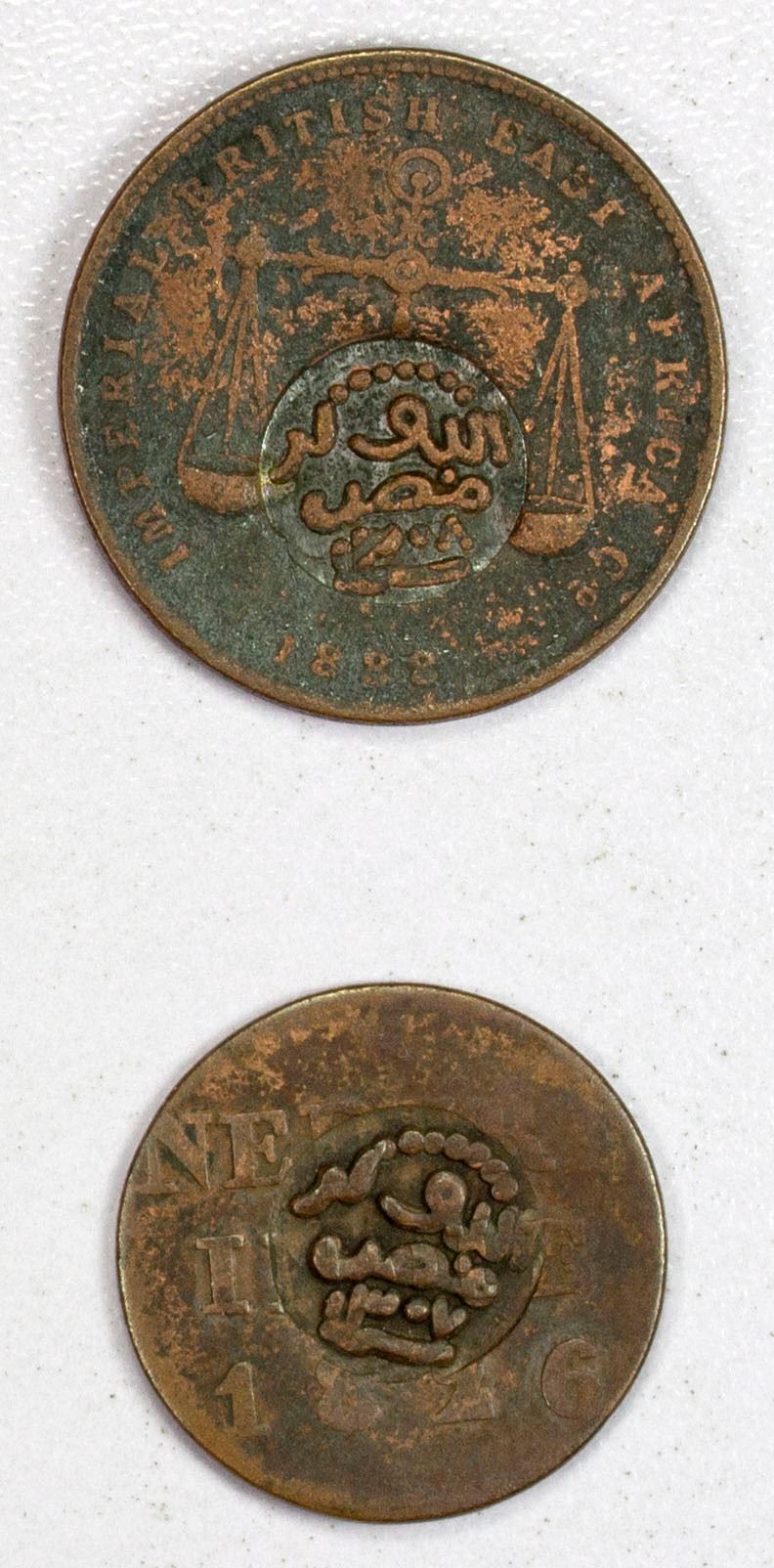 YEMEN: Shihr & Mukalla, LOT of 2 countermarked copper coins, issues of Awadh b. 'Umar, as Hakim, 1881-1902: countermarked al-dawla munassir sana plus the date: AH1307 on ¼ stuiver of Netherlands East Indies, and 1308 on pice of Mombasa 1888; both nearly uncirculated on very low grade hosts; retail value $150, lot of 2 pieces.