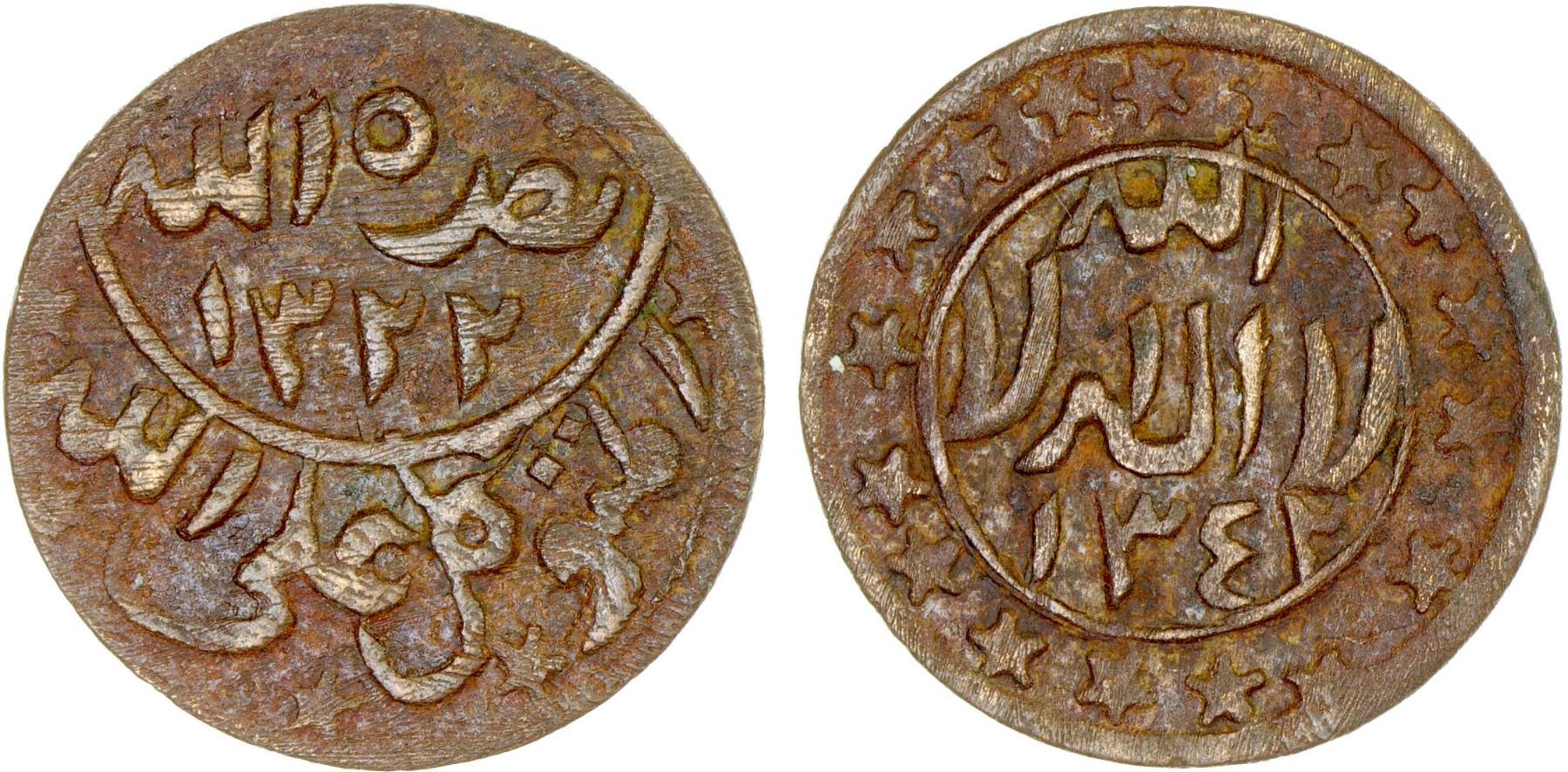 YEMEN: Yahya b. Muhammad, 1904-1948, AE zalat (1/160 riyal) (1.08g), NM, AH1342, Y-1.4, extremely rare type with obverse legend divided by crescent; some light porosity, but much nicer than the two examples filed on CoinArchives (last one sold in our Auction 46, lot 1351), VF, RRR. Six examples recorded on Zeno.