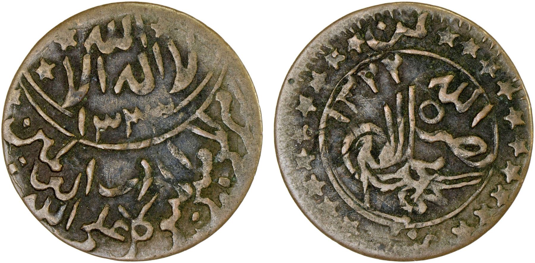 YEMEN: Yahya b. Muhammad, 1904-1948, AR 1/80 riyal (1.58g), NM, AH1333, Y-2.1, extremely rare type with a simplified toughra on the reverse (none on CoinArchives, only 3 dated AH1333 on Zeno), choice VF, RRR. There are 2 more dated AH1322 on both sides filed on Zeno, and one that appears to be AH13xx, all with the toughra.