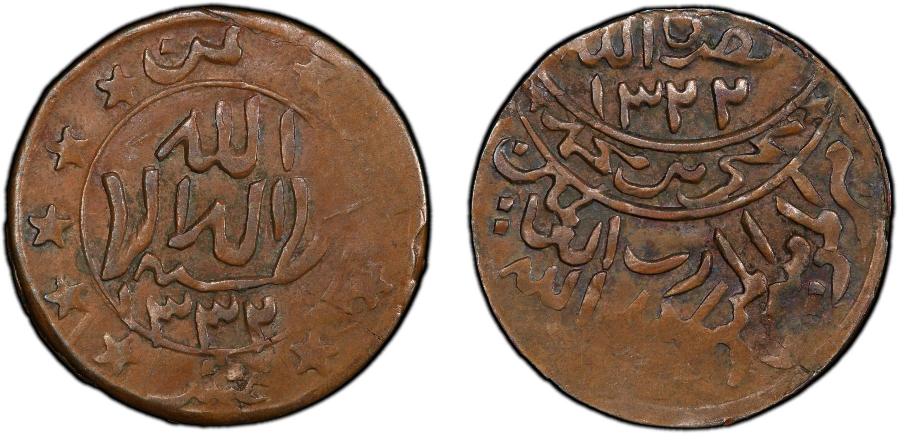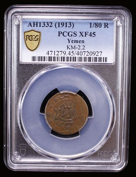 YEMEN: al-Mutawakkil Yahya bin Muhammad, 1904-1948, AE 1/80 riyal, Shaharah, AH1332, Y-2.2, 10 stars on reverse, 2 stars on obverse, PCGS graded EF45, ex The 1914 Collection. Finest graded by both PCGS and NGC.