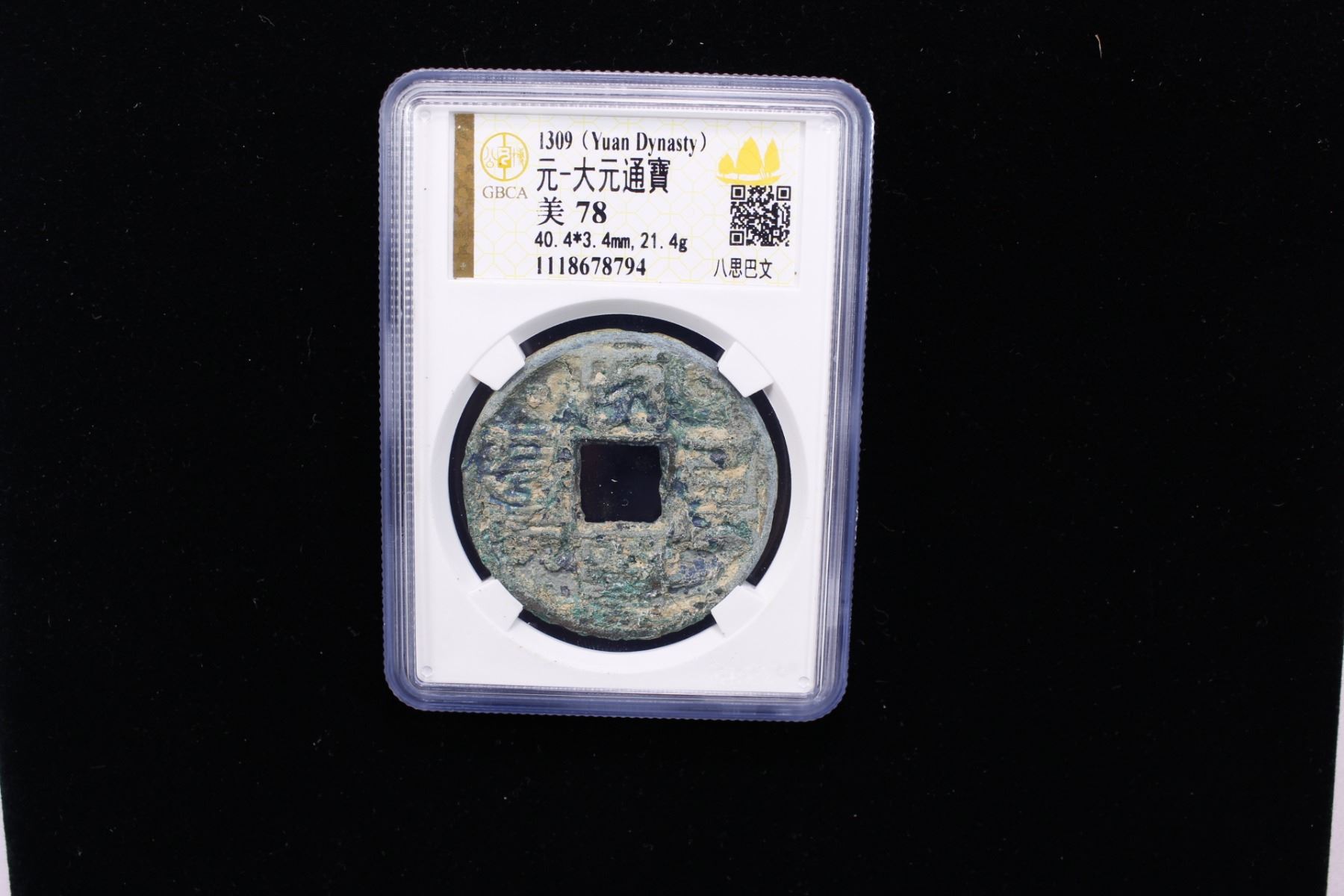 YUAN: Da Yuan, 1310-1311, AE 10 cash (21.4g), H-19.46, ta üen tong baw in Mongol 'Phags-pa script (da yuan tong bao in Chinese), graded 78 by GBCA Grading Company, encrustation, Fine, ex Dr. Dirk Löer Collection. Külüg Khan (Da Yuan), born Khayishan, meaning "wall" in Mongolian, was an Emperor of the Yuan Dynasty and is regarded as the seventh Great Khan of the Mongols in Mongolia. His name means "warrior Khan" or "fine horse Khan" in the Mongolian language.