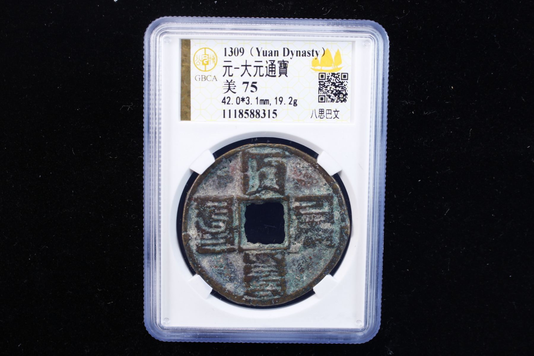 YUAN: Da Yuan, 1310-1311, AE 10 cash (25.9g), H-19.46, ta üen tong baw in Mongol 'Phags-pa script (da yuan tong bao in Chinese), graded 75 by GBCA Grading Company, F-VF, ex Dr. Dirk Löer Collection. Külüg Khan (Da Yuan), born Khayishan, meaning "wall" in Mongolian, was an Emperor of the Yuan Dynasty and is regarded as the seventh Great Khan of the Mongols in Mongolia. His name means "warrior Khan" or "fine horse Khan" in the Mongolian language.