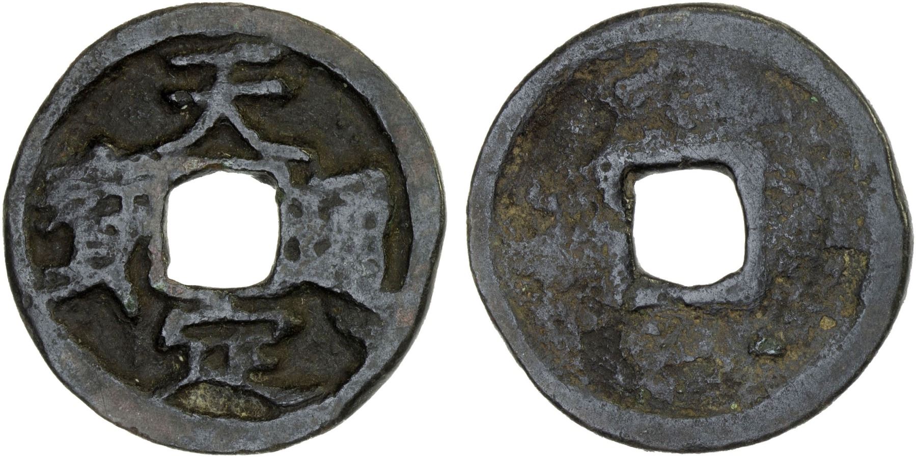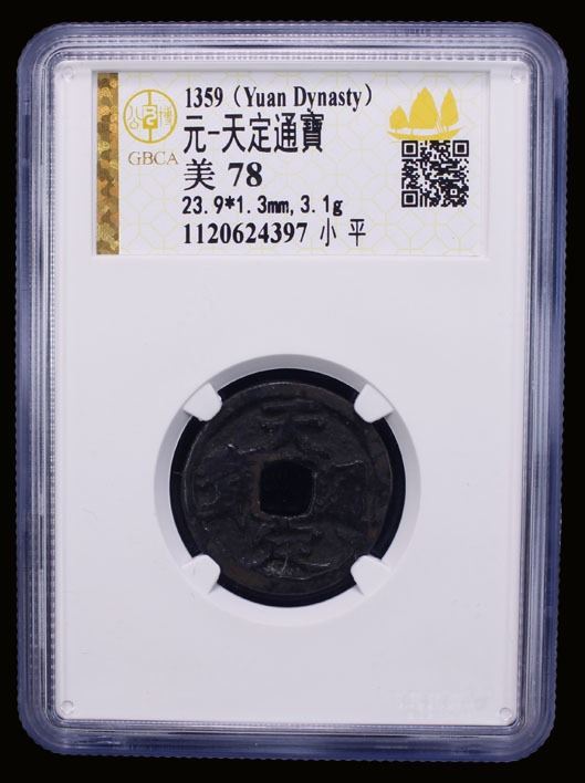 YUAN: Tian Ding, Rebel, 1359-1360, AE cash (3.1g), H-19.142, graded 78 by GBCA Grading Company, VF, ex Dr. Dirk Löer Collection, ex Stephen Album Auction 23, Lot 780; ex Jiùjinshan Collection. In August 1351, Xu Shouhui worked with others to establish the rebel army of Red Turbans under the pretense of the Buddhist White Lotus Society. In the following months of the Red Turban Rebellion, they captured Qishui and made it the command center of the Red Turbans and the capital of the newly declared Empire of Tianwan, with himself as the emperor. Xu Shouhui used the period titles Tian Qi in 1358 and Tian Ding in 1359-1360.
