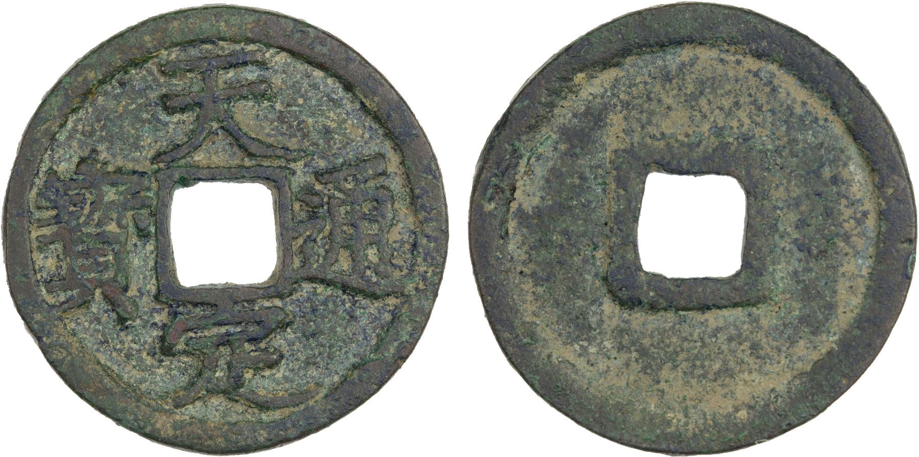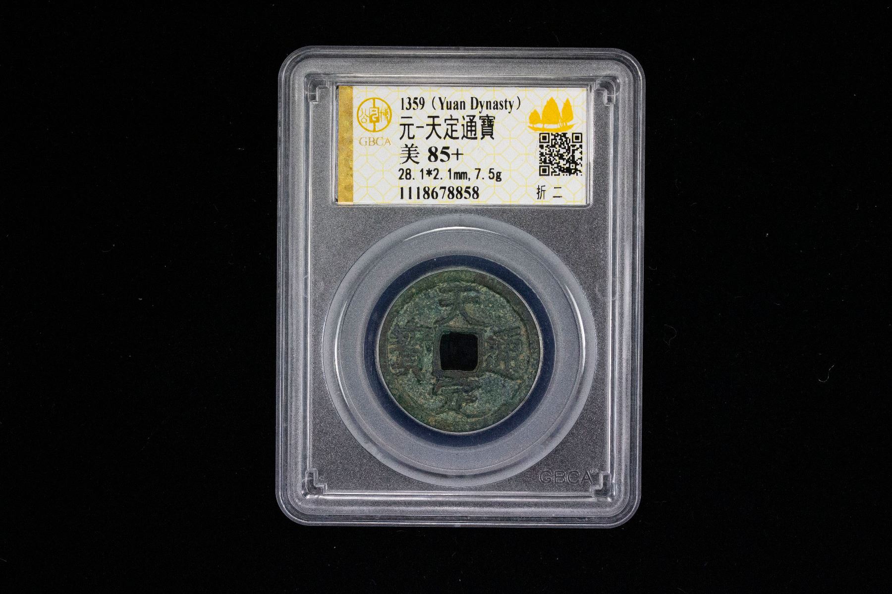 YUAN: Tian Ding, Rebel, 1359-1360, AE cash (4.1g), H-19.143, graded 85+ by GBCA Grading Company, VF-XF, ex Dr. Dirk Löer Collection. In August 1351, Xu Shouhui worked with others to establish the rebel army of Red Turbans under the pretense of the Buddhist White Lotus Society. In the following months of the Red Turban Rebellion, they captured Qishui and made it the command center of the Red Turbans and the capital of the newly declared Empire of Tianwan, with himself as the emperor. Xu Shouhui used the period titles Tian Qi in 1358 and Tian Ding in 1359-1360.