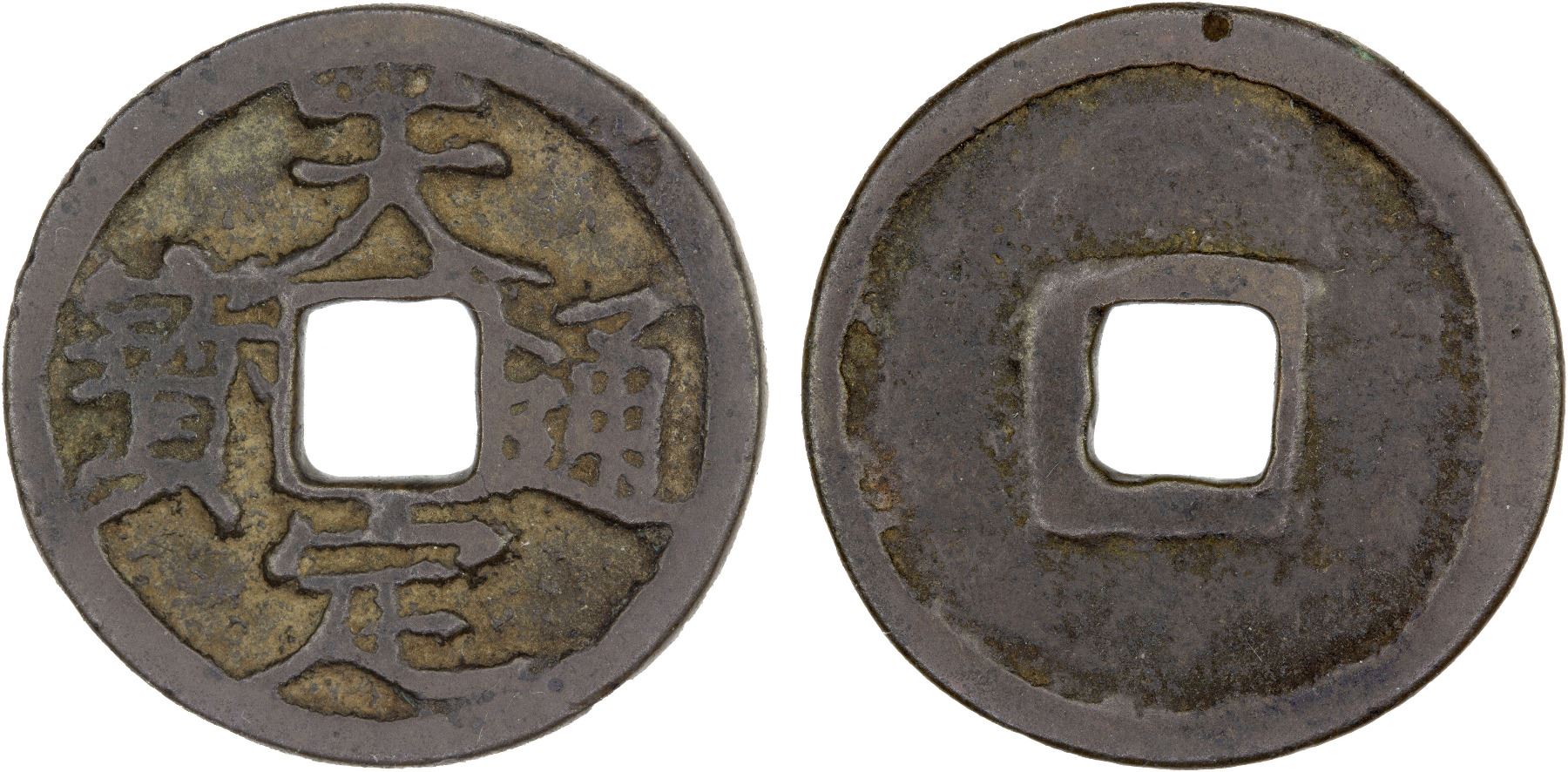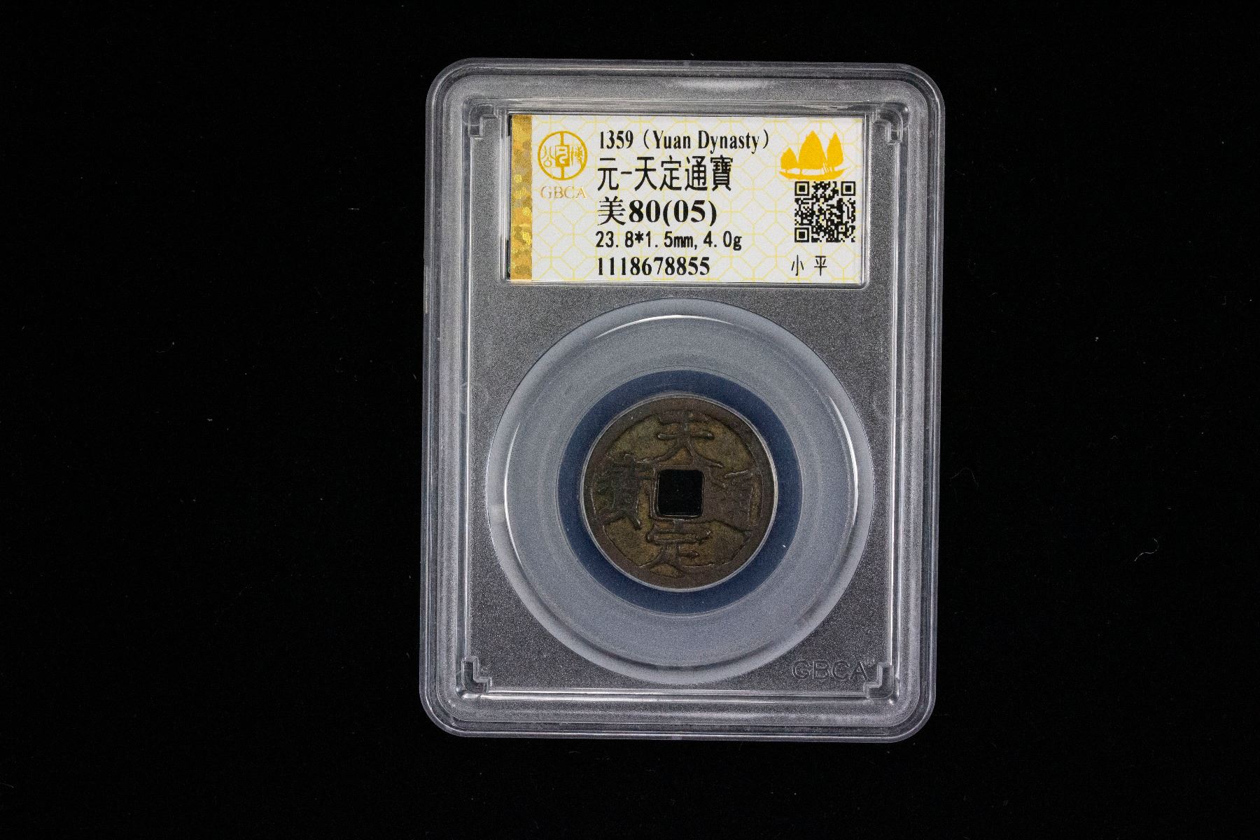 YUAN: Tian Ding, Rebel, 1359-1360, AE cash (4g), H-19.142, graded 80(05) by GBCA Grading Company, natural flan crack, VF, ex Dr. Dirk Löer Collection. In August 1351, Xu Shouhui worked with others to establish the rebel army of Red Turbans under the pretense of the Buddhist White Lotus Society. In the following months of the Red Turban Rebellion, they captured Qishui and made it the command center of the Red Turbans and the capital of the newly declared Empire of Tianwan, with himself as the emperor. Xu Shouhui used the period titles Tian Qi in 1358 and Tian Ding in 1359-1360.