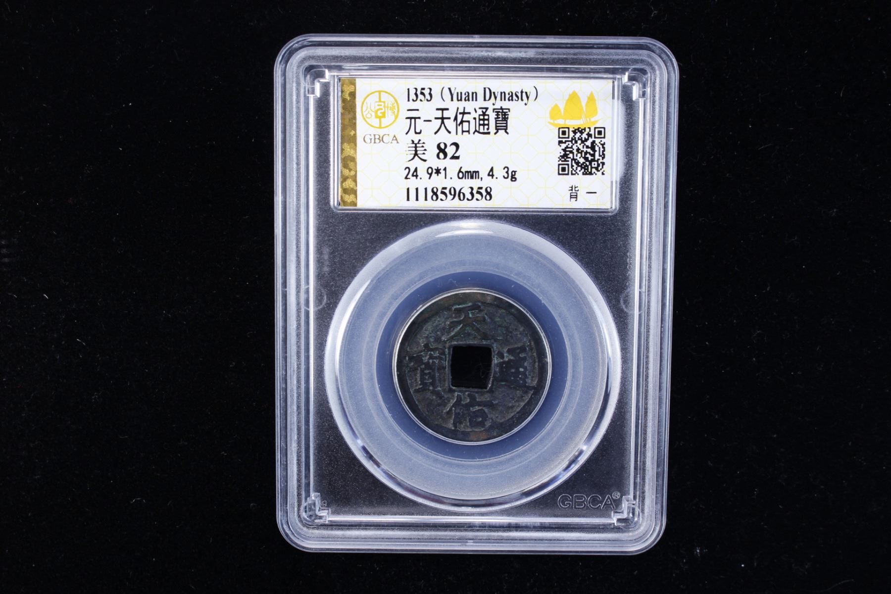 YUAN: Tian You, Rebel, 1354-1357, AE cash (4.3g), H-19.135, denomination yi (one) above on reverse, graded 82 by GBCA Grading Company, VF, ex Dr. Dirk Löer Collection. Zhang Shicheng was one of the leaders of the Red Turban Rebellion in the late Yuan Dynasty China. Later he established the Kingdom of Dazhou with reigning name Tianyou.