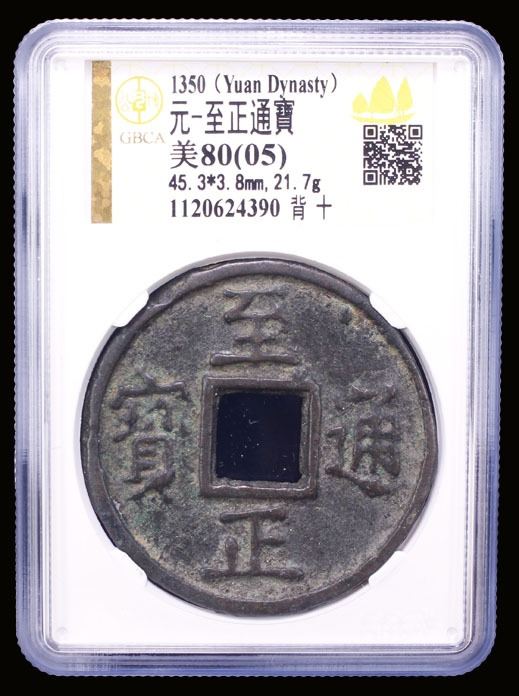 YUAN: Zhi Zheng, 1341-1368, AE 10 cash (21.7g), H-19.115, Mongolian 'Phags-pa script shi (ten) above for denominational name, graded 80(05) by GBCA Grading Company, VF, ex Dr. Dirk Löer Collection. Toghon Temür, also known by the posthumous name Shundi bestowed by the Hongwu Emperor of the Ming dynasty, was a son of Kus'ala. Toghon Temür ruled as emperor of the Yuan dynasty and is considered the last Khagan of the Mongol Empire. He bore the period titles Yuan Tong 1333-1334, Zhi Yuan 1335-1340, and Zhi Zheng 1341-1368.