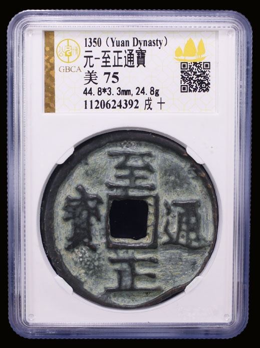 YUAN: Zhi Zheng, 1341-1368, AE 10 cash (24.8g), H-19.117, Mongolian 'Phags-pa seu for Chinese cyclical date wu xu above on reverse & Chinese shi (ten) for denomination below with dot directly above, graded 75 by GBCA Grading Company, Fine, ex Dr. Dirk Löer Collection. Toghon Temür, also known by the posthumous name Shundi bestowed by the Hongwu Emperor of the Ming dynasty, was a son of Kus'ala. Toghon Temür ruled as emperor of the Yuan dynasty and is considered the last Khagan of the Mongol Empire. He bore the period titles Yuan Tong 1333-1334, Zhi Yuan 1335-1340, and Zhi Zheng 1341-1368.