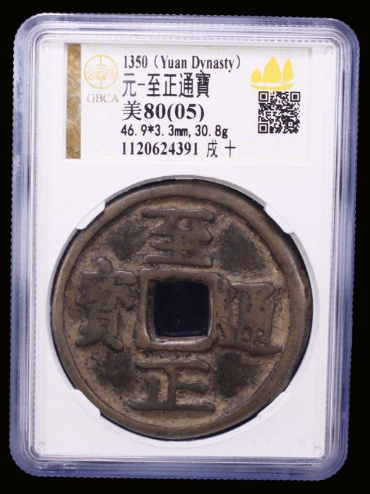 YUAN: Zhi Zheng, 1341-1368, AE 10 cash (30.8g), H-19.117, Mongolian 'Phags-pa seu for Chinese cyclical date wu xu above on reverse & Chinese shi (ten) for denomination below with dot directly above, graded 80(05) by GBCA Grading Company, Fine, ex Dr. Dirk Löer Collection, ex Stephen Album Auction 23, Lot 772; ex Shèngbidébao Collection. Toghon Temür, also known by the posthumous name Shundi bestowed by the Hongwu Emperor of the Ming dynasty, was a son of Kus'ala. Toghon Temür ruled as emperor of the Yuan dynasty and is considered the last Khagan of the Mongol Empire. He bore the period titles Yuan Tong 1333-1334, Zhi Yuan 1335-1340, and Zhi Zheng 1341-1368.