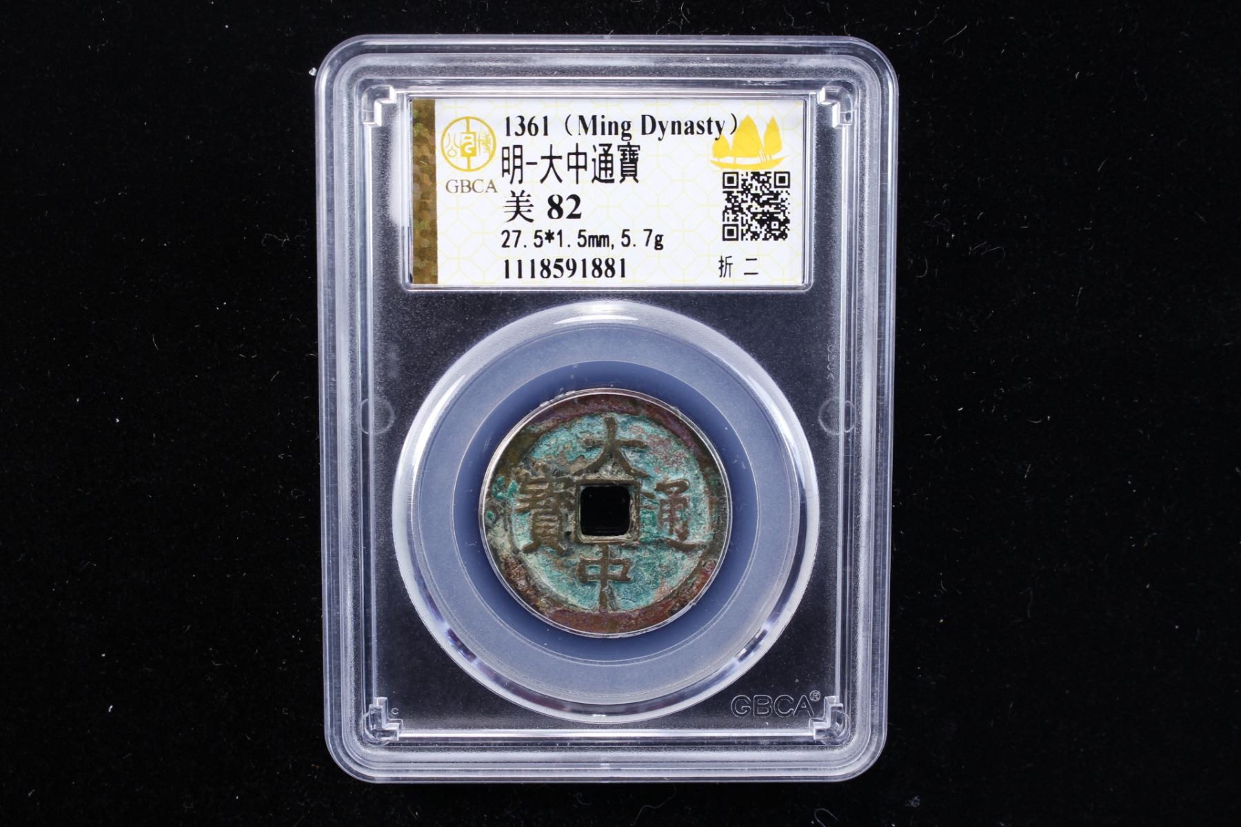 YUAN: Zhi Zheng, 1341-1368, AE 3 cash (20.2g), H-20.13, graded 82 by GBCA Grading Company, VF. The first cash coins issued by Zhu Yuanzhang actually bore the inscription "Dazhong Tongbao" because he wanted to name his name country the "Great Zhong" dynasty but eventually the name was settled on the "Great Ming" dynasty. The Hongwu period was proclaimed in 1368 and the introduction of the Hongwu Tongbao coins began then. Despite the new coinage being issued the "Dazhong Tongbao" coins would continue to be cast as reconquering China from the Mongols took several more years.