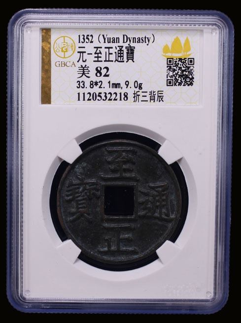 YUAN: Zhi Zheng, 1341-1368, AE 3 cash (9g), H-19.105, Mongolian 'Phags-pa script shin above for Chinese cyclical date ren chen, graded 82 by GBCA Grading Company, VF-XF. Toghon Temür, also known by the posthumous name Shundi bestowed by the Hongwu Emperor of the Ming dynasty, was a son of Kus'ala. Toghon Temür ruled as emperor of the Yuan dynasty and is considered the last Khagan of the Mongol Empire. He bore the period titles Yuan Tong 1333-1334, Zhi Yuan 1335-1340, and Zhi Zheng 1341-1368.