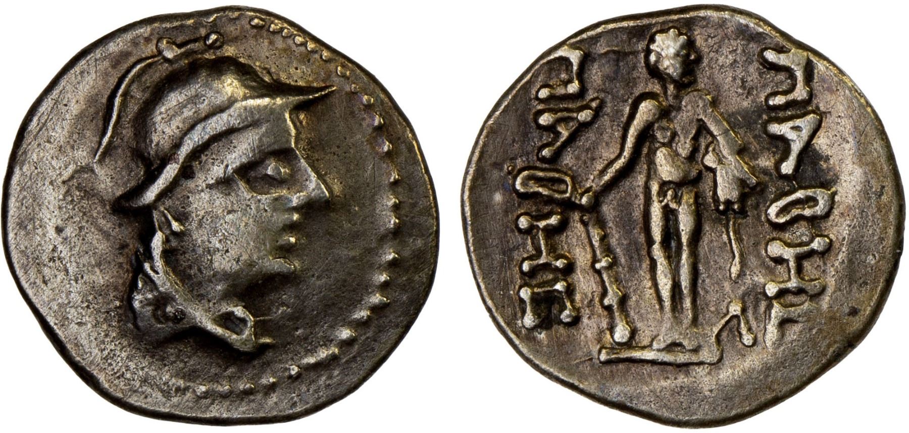 YUEH CHI: Pabes, late 1st century BC, AR obol (0.58g), Mitch-2834, Pieper-1699, helmeted bust right of Indo-Greek style // Hercules standing, holding club & lionskin, with the name PABES both sides; lovely example! VF-XF.