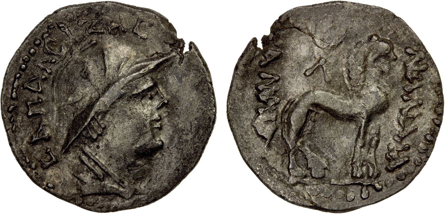 YUEH CHI: Sapadbizes, late 1st century BC, AR drachms (1.39g), Mitch-2829-30, Senior-A6.1, helmeted bust right, floral design on the helmet, CAΠAΔBIZH-C // lion right, citing NANAIA on both sides of the lion, crescent over Λ above, well struck, light porosity, VF-EF.