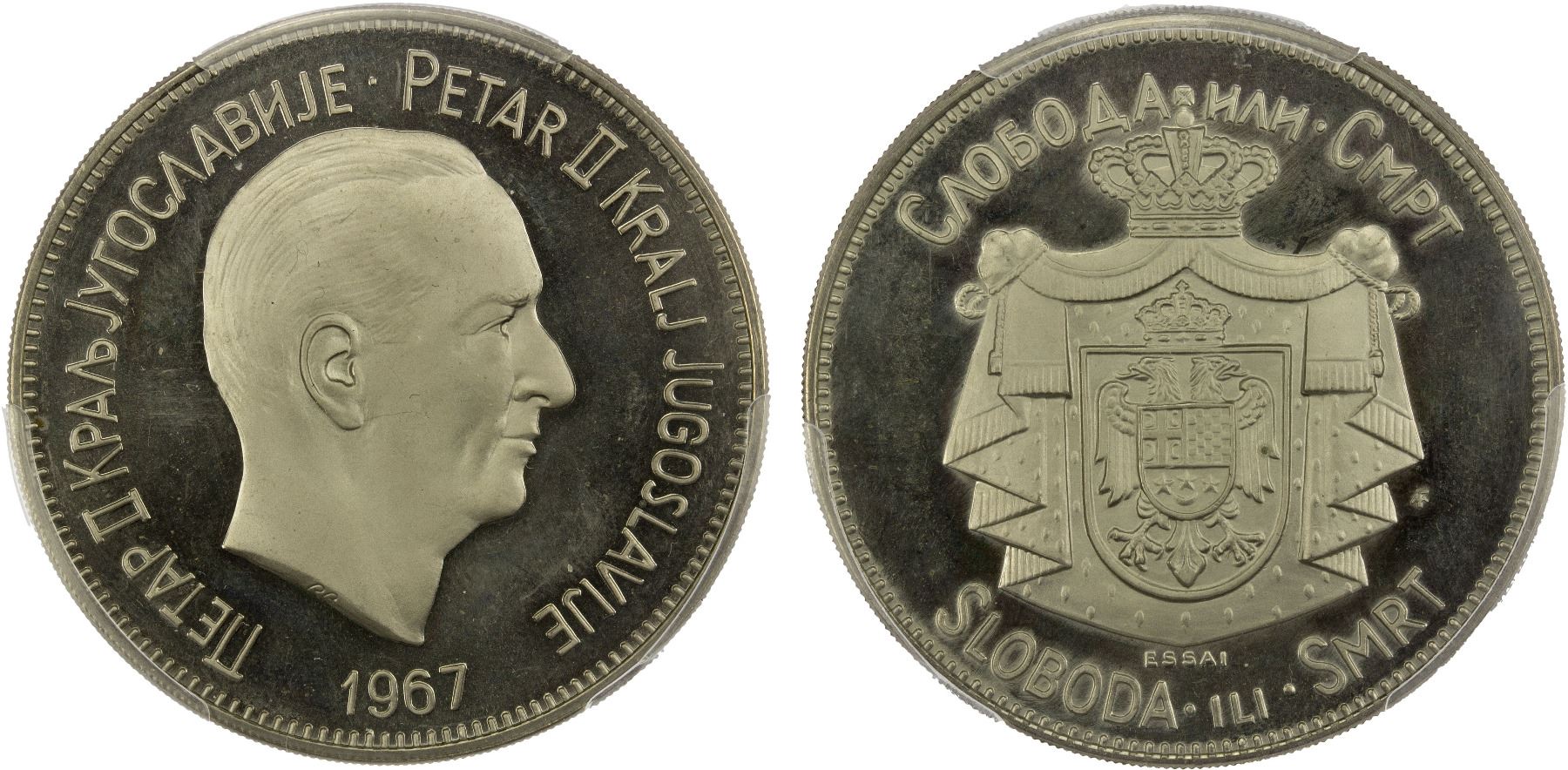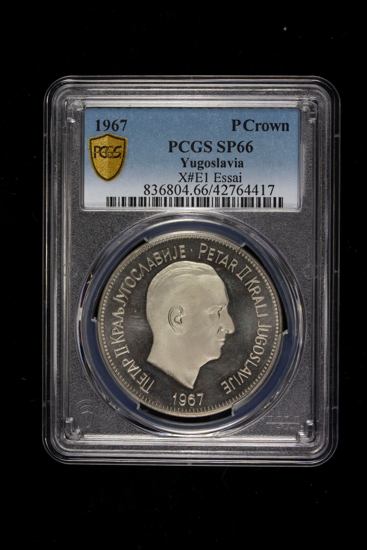 YUGOSLAVIA: Peter II, crown, 1967, KM-XE1, essai issue, Franklin Mint, struck in genuine franklinium, government in exile, mintage of only 1,002 pieces, a spectacular example, PCGS graded Specimen 68, S.