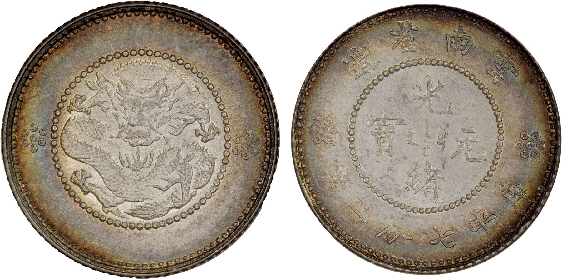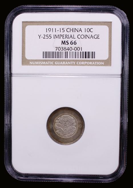 YUNNAN: Republic, AR 10 cents, ND (1911-5), Y-255, L&M-424, struck posthumously in the name of Emperor Kuang Hsu, exquisite multicolored peripheral toning, a lovely example! NGC graded MS66, ex The 1914 Collection. Apparently restruck from previously unused dies.