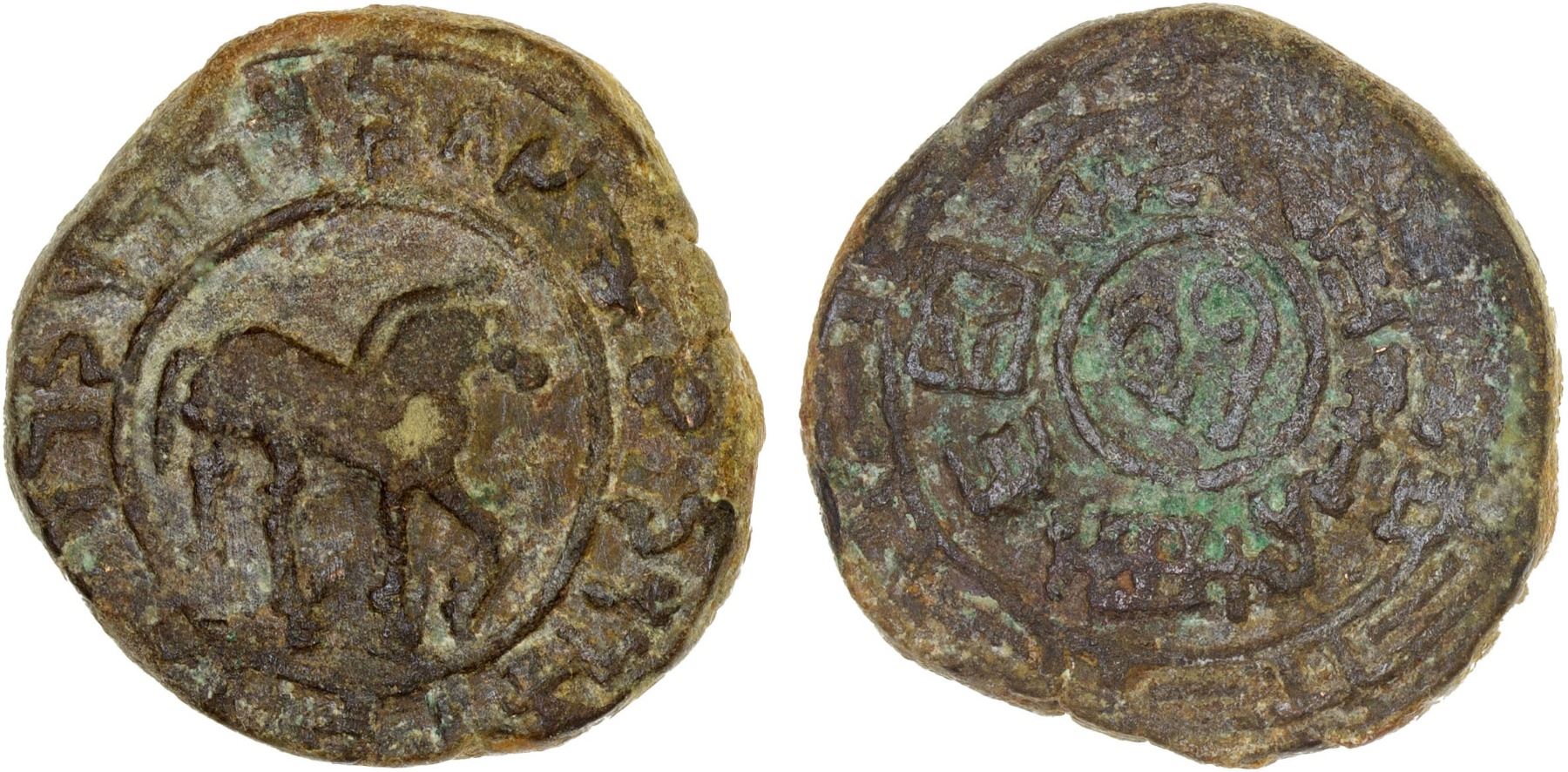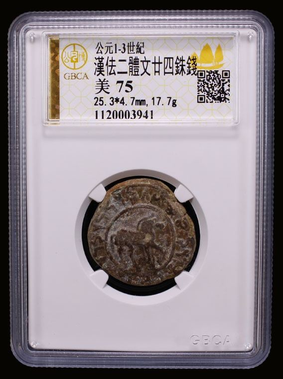 YUTIAN KINGDOM: Anonymous, ca. 2nd-3rd century, AE 24 zhu (17.7g), Cribb-7/8, Sino-Kharosthi series, struck posthumously in the name of Gurgamoya (ca. 30-60 AD), horse right within central circle, traces of Kharosthi legend in the margin // local symbol within central circle, Chinese inscription zhong nian si zhu tong qian ("copper coin weighing 24 zhu") in the margin, and ornate outer border, some porosity, graded 75 by GBCA Grading Company, Fine, ex Dr. Dirk Löer Collection. The Yutian Kingdom was located in the Khotan (Hetian) region in today's southwestern Xinjiang, China. See Cribb's articles in Numismatic Chronicle, Volumes 144 & 145 (1984 & 1985).