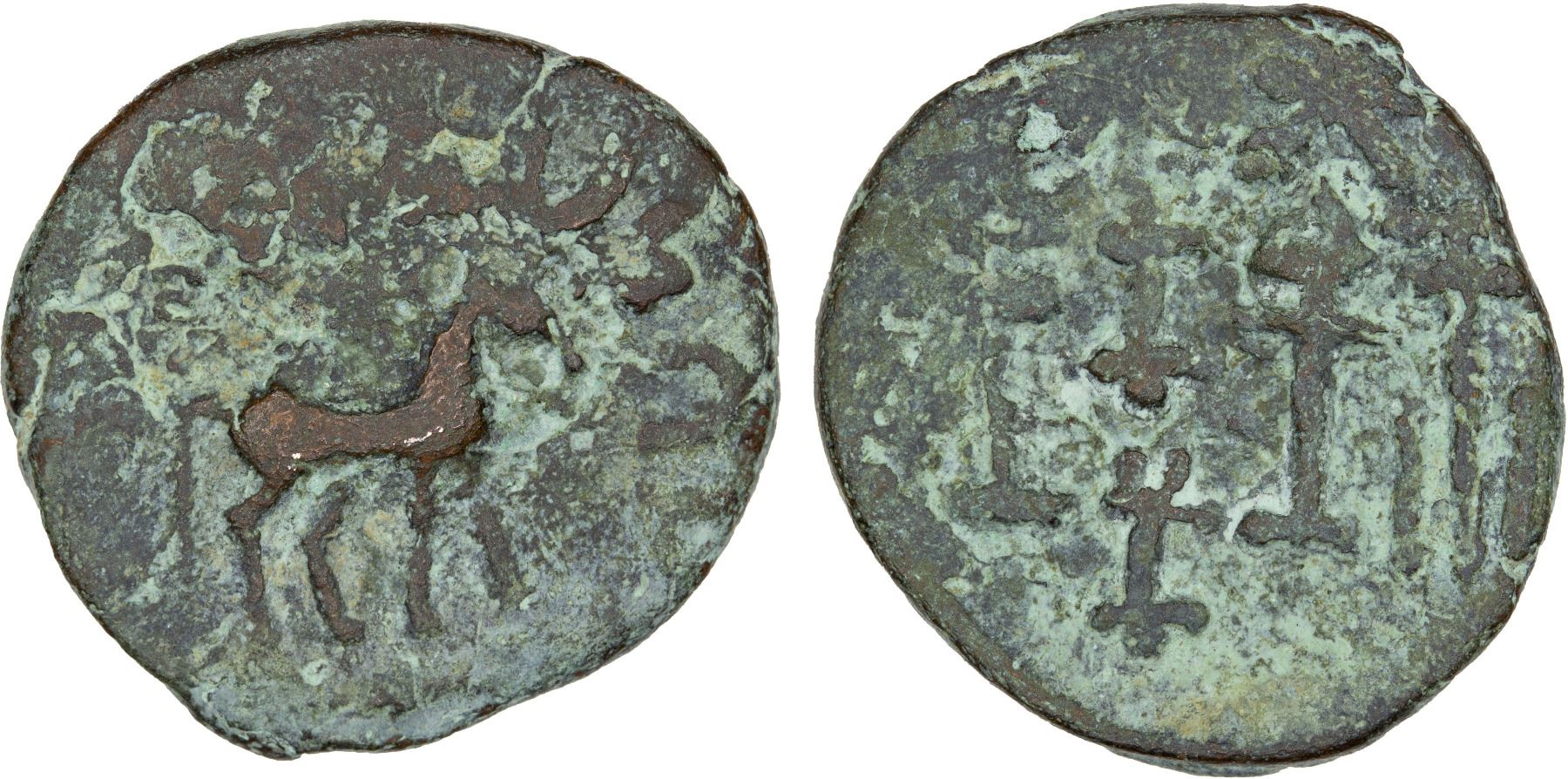 YUTIAN KINGDOM: Anonymous, ca. 2nd-3rd century, AE 6 zhu (3.57g), Cribb-type 2/5, Sino-Kharosthi series, struck posthumously in the name of Gurgamoya (ca. 30-60 AD), horse right, Kharosthi legend around // Han Dynasty period Chinese inscription, standard Chinese character for "6" above; decent strike, VF, R. The Yutian Kingdom was located in the Khotan (Hetian) region in today's southwestern Xinjiang, China. See Cribb's articles in Numismatic Chronicle Volumes 144 & 145 (1984 & 1985).
