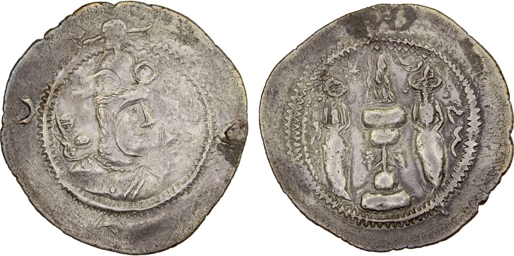 ZABULISTAN: Anonymous, ca. 700, AR drachm (3.70g), Göbl-263, bust right, buffalo-head crown, 3 crescents in margin // standing Sasanian attendants, blundered legends, VF-XF, R, ex SARC Auction 23 Lot 57. Zabulistan was a historical region in southern Afghanistan roughly corresponding to the modern provinces of Zabul and Ghazni.