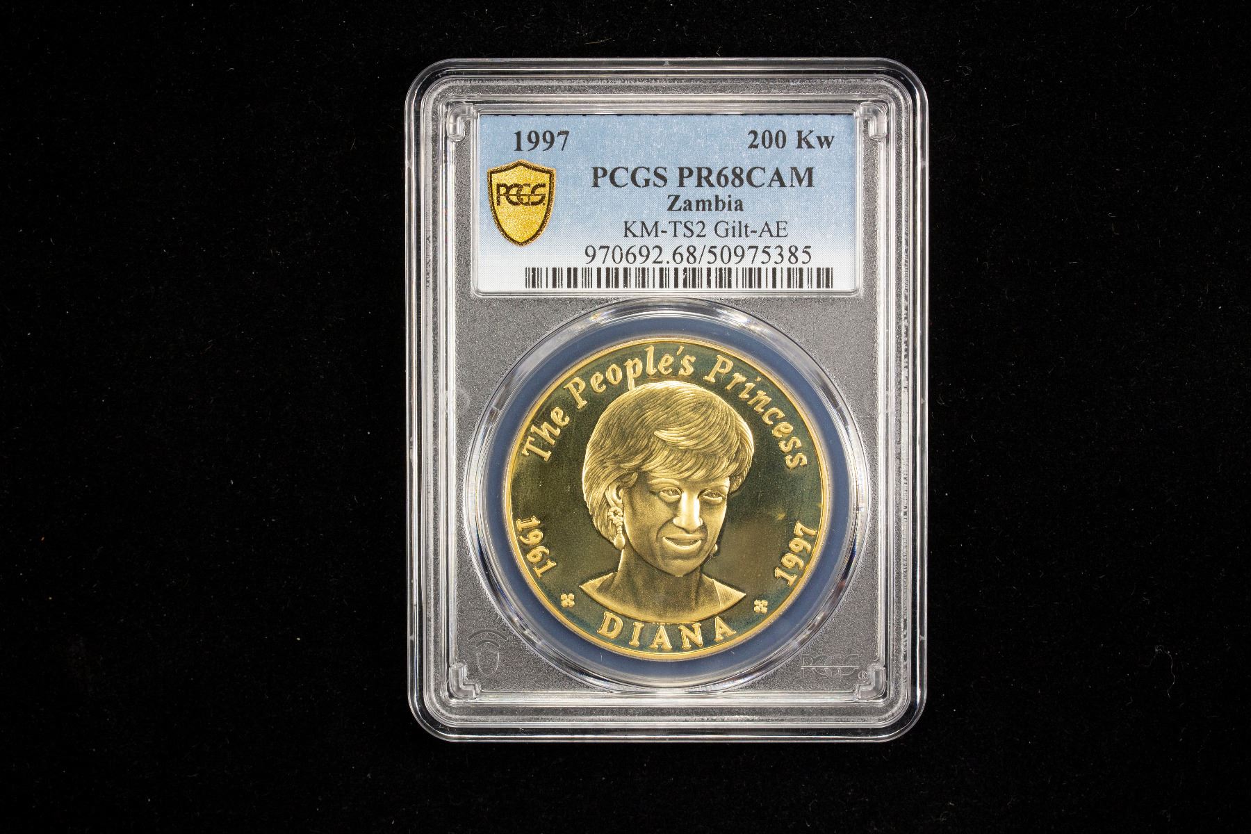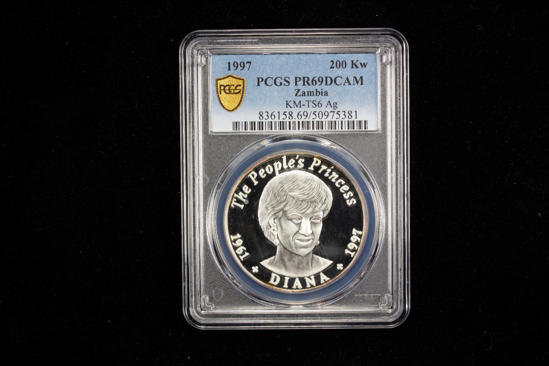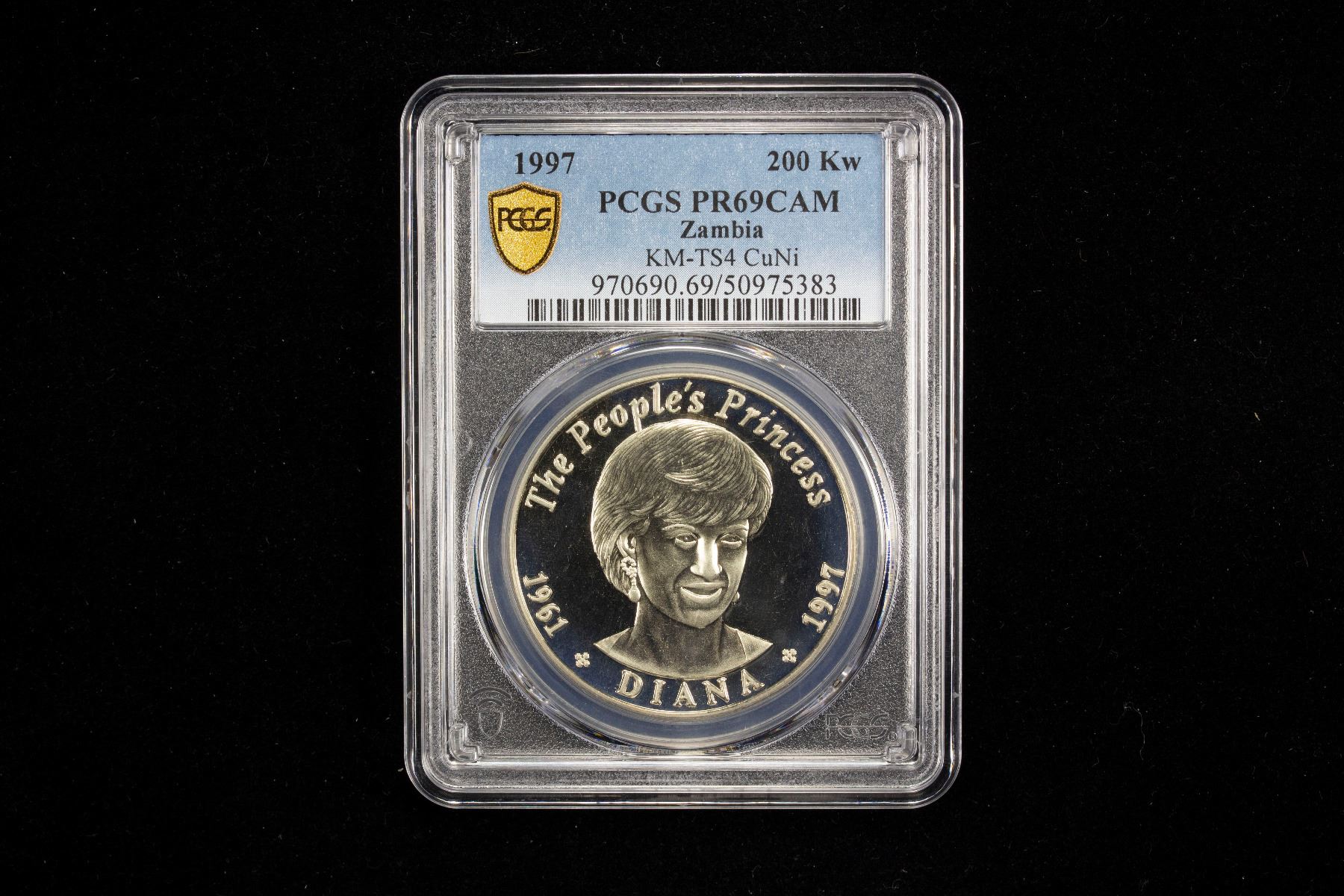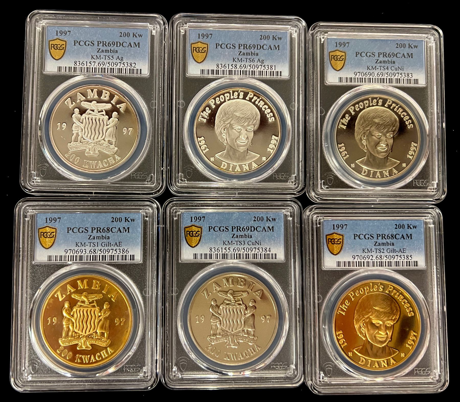ZAMBIA: Republic, 6-coin proof set, 1997, collection of PCGS-graded 200 kwacha proof trial strike issues: Death of Princess Diana commemoratives including; Cupro-nickel KM-52 obverse & reverse trial strikes in PF-69 CAM and PF-69 DCAM; Silver KM-52a obverse and reverse trial strikes, both PF-69 DCAM, and Bronze KM-52b obverse & reverse trial strikes, both in PF-68 CAM, a very rare modern African set with a mintage of only 50 sets, with original case of issue, set of 6 pieces.