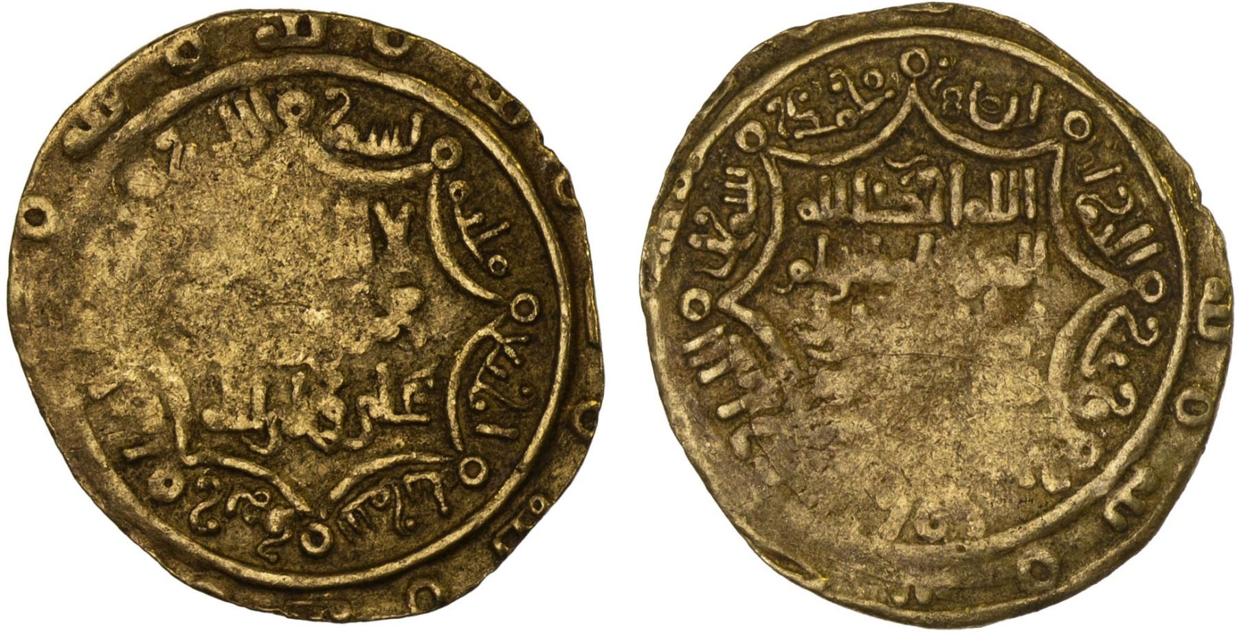 ZAYDI IMAMS OF HAWSAM: temp. Abu'l-Husayn al-Mu'ayyad, ca. 990-1020, AV fractional dinar (0.98g), Hawsam, AH400, A-N1524, cf. Zeno-161246, looped octalobe on each side, Shi'ite kalima in the obverse center, Qur'an sura 112 in the reverse field, and lillah repeated in outer margin 8 times on each side; about 20% flat on both sides, F-VF, RR.