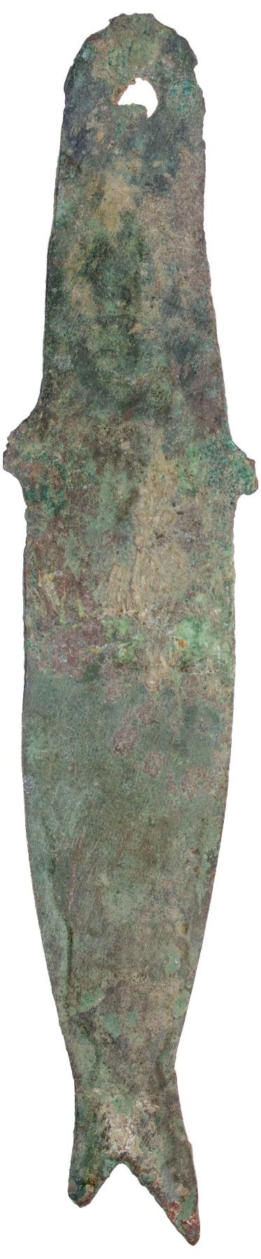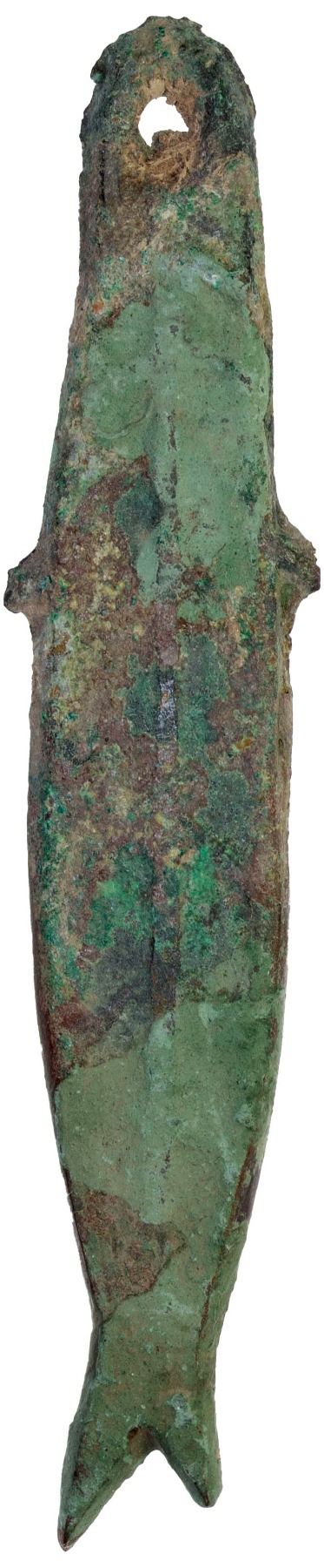 ZHOU: Spring-Autumn Period, 770-475 BC, AE 'fish money' (13.30g), cf. Zeno-194574, 82mm, cast in the shape of fish with hole for threading (as made), foliate lines on one side, made by various "barbarian tribes" (yí) along the Yellow River during the Shang and early Zhou Dynasties, Fine, ex Dr. Dirk Löer Collection. These types are mentioned in Coole, Jen, and other references with ambiguous statements regarding their possible use as money. Their frequent presence in ancient tombs perhaps suggests a funerary purpose.