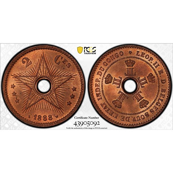 14 - BELGIAN CONGO: Leopold II, 1885-1909, AE 2 centimes, 1888, PCGS MS65 RBStephen Album Rare Coins