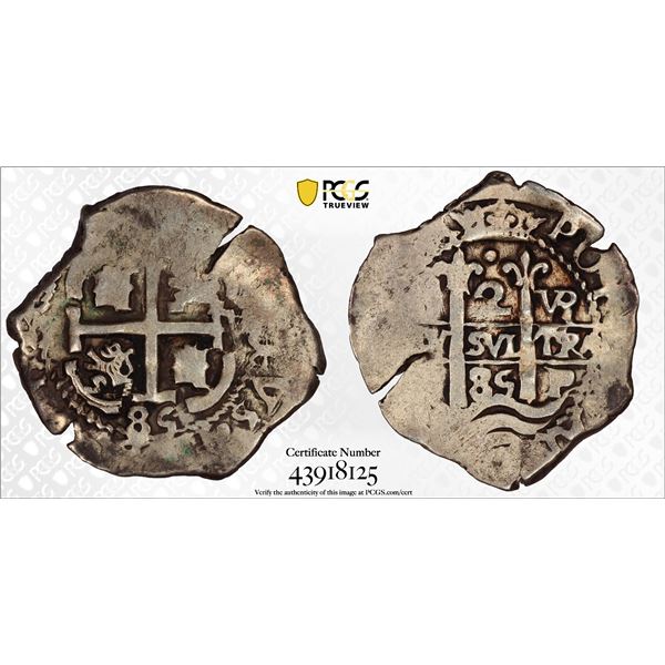 BOLIVIA: Carlos II, 1665-1700, AR 2 reales (7.07g), 1685-P, KM-24, 'cob' type, assayer VR, with two clear dates, PCGS graded VF35.