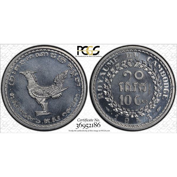 27 - CAMBODIA: Norodom Sihanouk, 1941-1955, 10 sen, 1953, PCGS Specimen 66Stephen Album Rare Coins