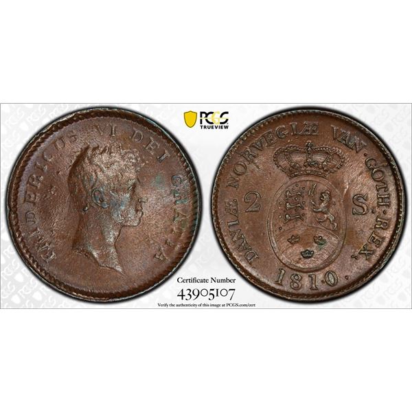 50 - DENMARK: Frederik VI, 1808-1839, AE 2 skliing, 1810, PCGS MS64 BNStephen Album Rare Coins