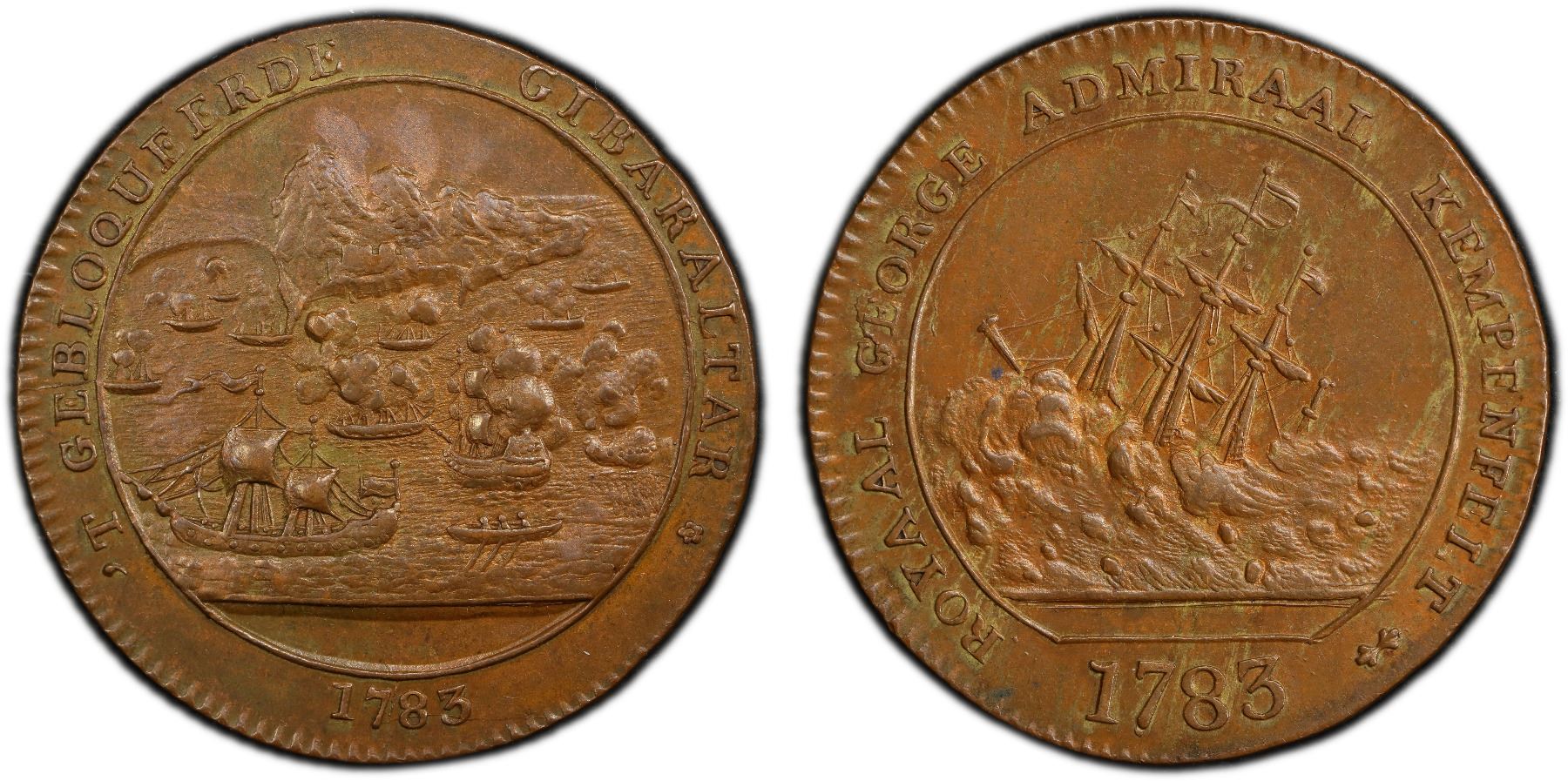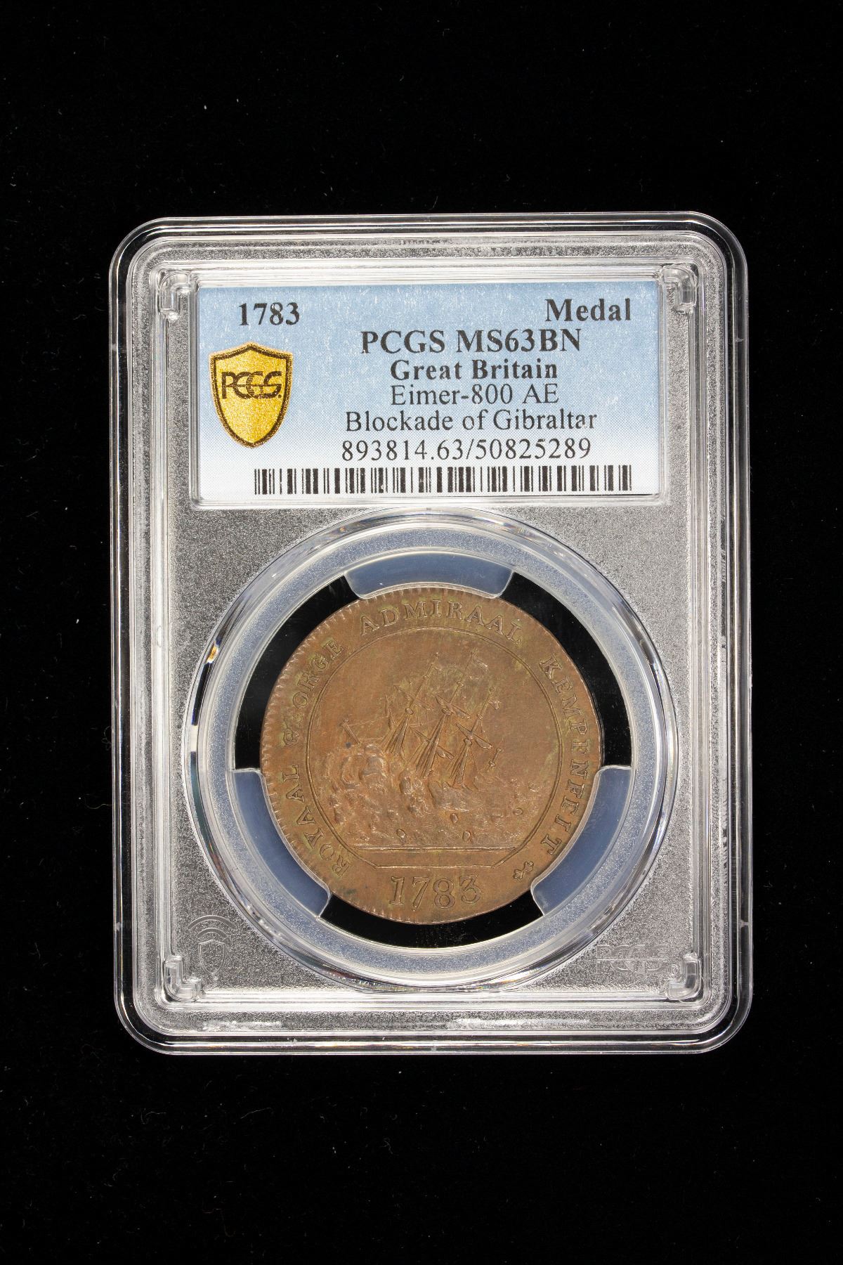 NETHERLANDS: Willem II, 1792-1849, AE medal (10.23g), 1783, Eimer-800, 33mm, bronze medal commemorating the "Blockade of Gibraltar and the Sinking of HMS Royal George", view of the Rock of Gibraltar and ships engaged, / T GEBLOQUEERDE GIBARALTAR (Gibraltar blockade), Exergue: 1783 // The Royal George sinking, / ROYAAL GEORGE ADMIRAAL KEMPENFELT (Royal George Admiral Kempenfelt) / 1783, a lovely lustrous chocolate-brown mint state example! PCGS graded MS63 BN. This Dutch-made medal draws attention to the two military setbacks of the British Empire in 1782. Spain, in alliance with France, blockaded Gibraltar during the Great Siege of Gibraltar, which took place during the American Revolutionary War; they combined forces to blockade the British-held territory by both land and sea. HMS Royal George sank on August 29, 1782 while anchored at Spithead off Portsmouth. The ship was intentionally rolled (a 'parliamentary heel') so maintenance could be performed on the hull, but the roll became unstable and out of control; the ship took on water and sank. More than 800 people died, making it one of the deadliest maritime disasters in British territorial waters.This is the second finest known example graded at PCGS.