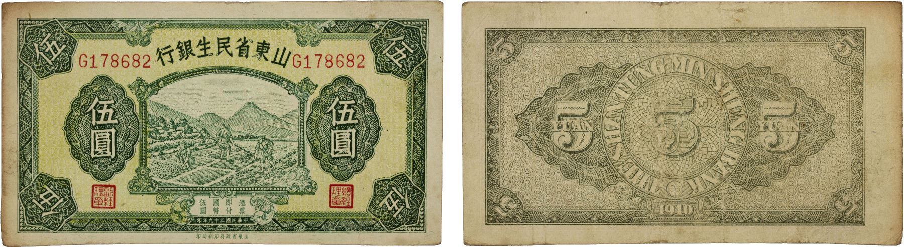 CHINA: Republic, 5 yuan, 1940, Pick-S2742a, Smith & Matravers-S45-32, Shantung Min Sheng Bank, peasants cultivating, Fine.
