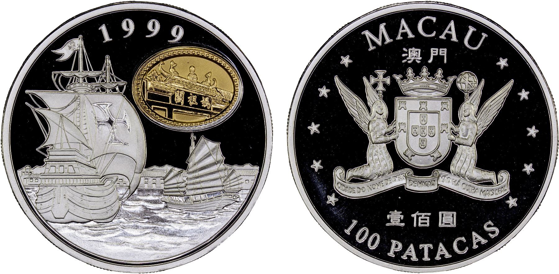 MACAO: Portuguese Territory, AR 100 patacas, 1999, KM-96, Return to China commemorative, contains 0.925 troy ounces of pure silver, with COA and original Royal Canadian Mint deluxe case of issue, Proof. The coin depicts a Portuguese ship and a Chinese junk, portraying Macau as a city where the cultures of the East and the West become one. The oval-shaped 24-karat gold-plated cameo depicts the historical building of Macau, Ma Gao Temple (Pagoda de Barra).